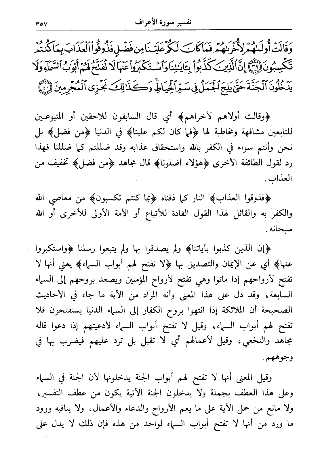 وَقَالَتْ أُولَاهُمْ لِأُخْرَاهُمْ فَمَا كَانَ لَكُمْ عَلَيْنَا مِنْ فَضْلٍ فَذُوقُوا الْعَذَابَ بِمَا كُنْتُمْ تَكْسِبُونَ (39) إِنَّ الَّذِينَ كَذَّبُوا بِآيَاتِنَا وَاسْتَكْبَرُوا عَنْهَا لَا تُفَتَّحُ لَهُمْ أَبْوَابُ السَّمَاءِ وَلَا يَدْخُلُونَ الْجَنَّةَ حَتَّى يَلِجَ الْجَمَلُ فِي سَمِّ الْخِيَاطِ وَكَذَلِكَ نَجْزِي الْمُجْرِمِينَ (40)