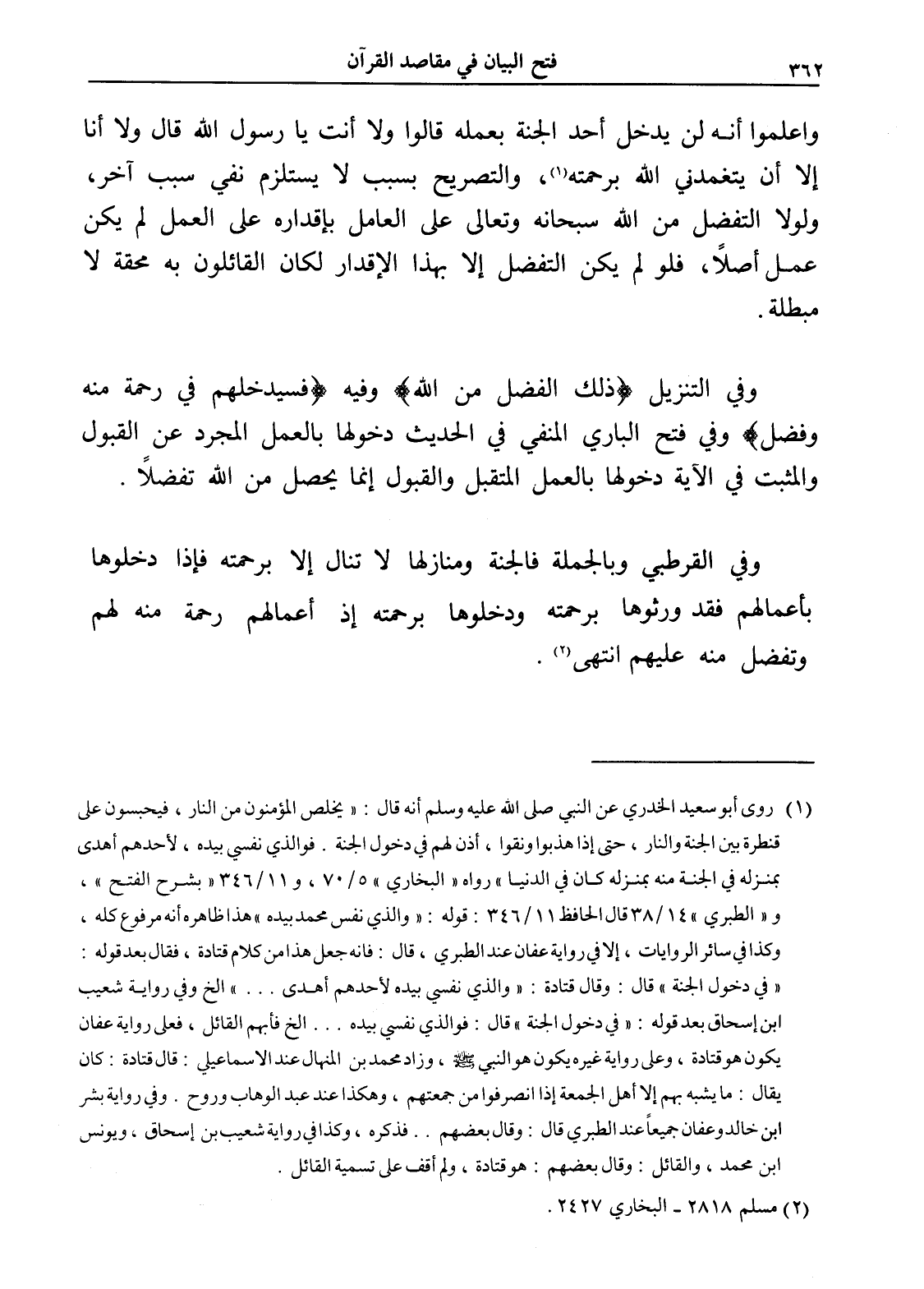 وفي التنزيل (ذلك الفضل من الله) وفيه (فسيدخلهم في رحمة منه وفضل) وفي فتح الباري المنفي في الحديث دخولها بالعمل المجرد عن القبول والمثبت في الآية دخولها بالعمل المتقبل والقبول إنما يحصل من الله تفضلاً.