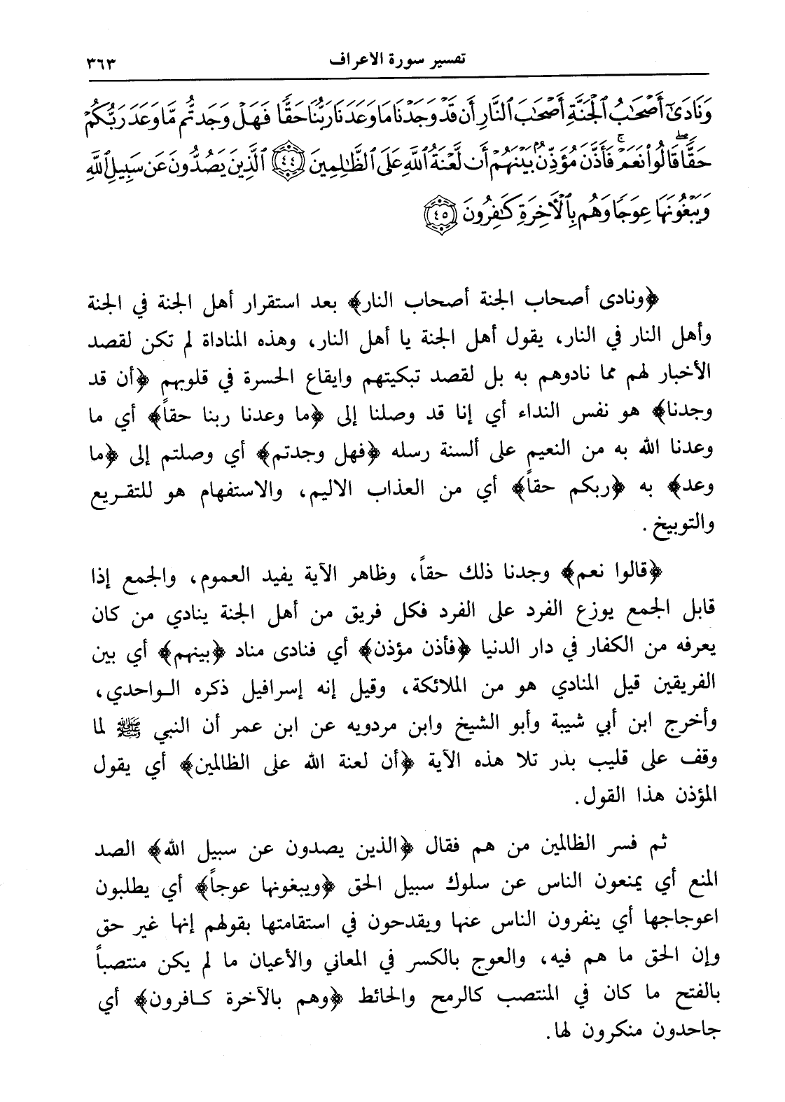 وَنَادَى أَصْحَابُ الْجَنَّةِ أَصْحَابَ النَّارِ أَنْ قَدْ وَجَدْنَا مَا وَعَدَنَا رَبُّنَا حَقًّا فَهَلْ وَجَدْتُمْ مَا وَعَدَ رَبُّكُمْ حَقًّا قَالُوا نَعَمْ فَأَذَّنَ مُؤَذِّنٌ بَيْنَهُمْ أَنْ لَعْنَةُ اللَّهِ عَلَى الظَّالِمِينَ (44) الَّذِينَ يَصُدُّونَ عَنْ سَبِيلِ اللَّهِ وَيَبْغُونَهَا عِوَجًا وَهُمْ بِالْآخِرَةِ كَافِرُونَ (45)