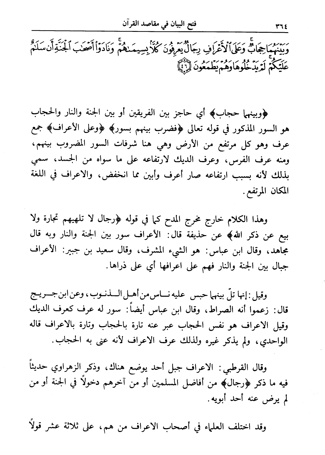 (وبينهما حجاب) أي حاجز بين الفريقين أو بين الجنة والنار والحجاب هو السور المذكور في قوله تعالى (فضرب بينهم بسور) (وعلى الأعراف) جمع عرف وهو كل مرتفع من الأرض وهي هنا شرفات السور المضروب بينهم، ومنه عرف الفرس، وعرف الديك لارتفاعه على ما سواه من الجسد، سمي بذلك لأنه بسبب ارتفاعه صار أعرف وأبين مما انخفض، والأعراف في اللغة المكان المرتفع.