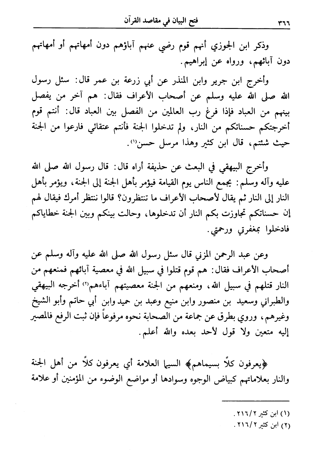 وأخرج ابن جرير وابن المنذر عن أبي زرعة بن عمر قال: سئل رسول الله صلى الله عليه وسلم عن أصحاب الأعراف فقال: هم آخر من يفصل بينهم من العباد فإذا فرغ رب العالمين من الفصل بين العباد قال: أنتم قوم أخرجتكم حسناتكم من النار، ولم تدخلوا الجنة فأنتم عتقائي فارعوا من الجنة حيث شئتم، قال ابن كثير وهذا مرسل حسن (¬1).