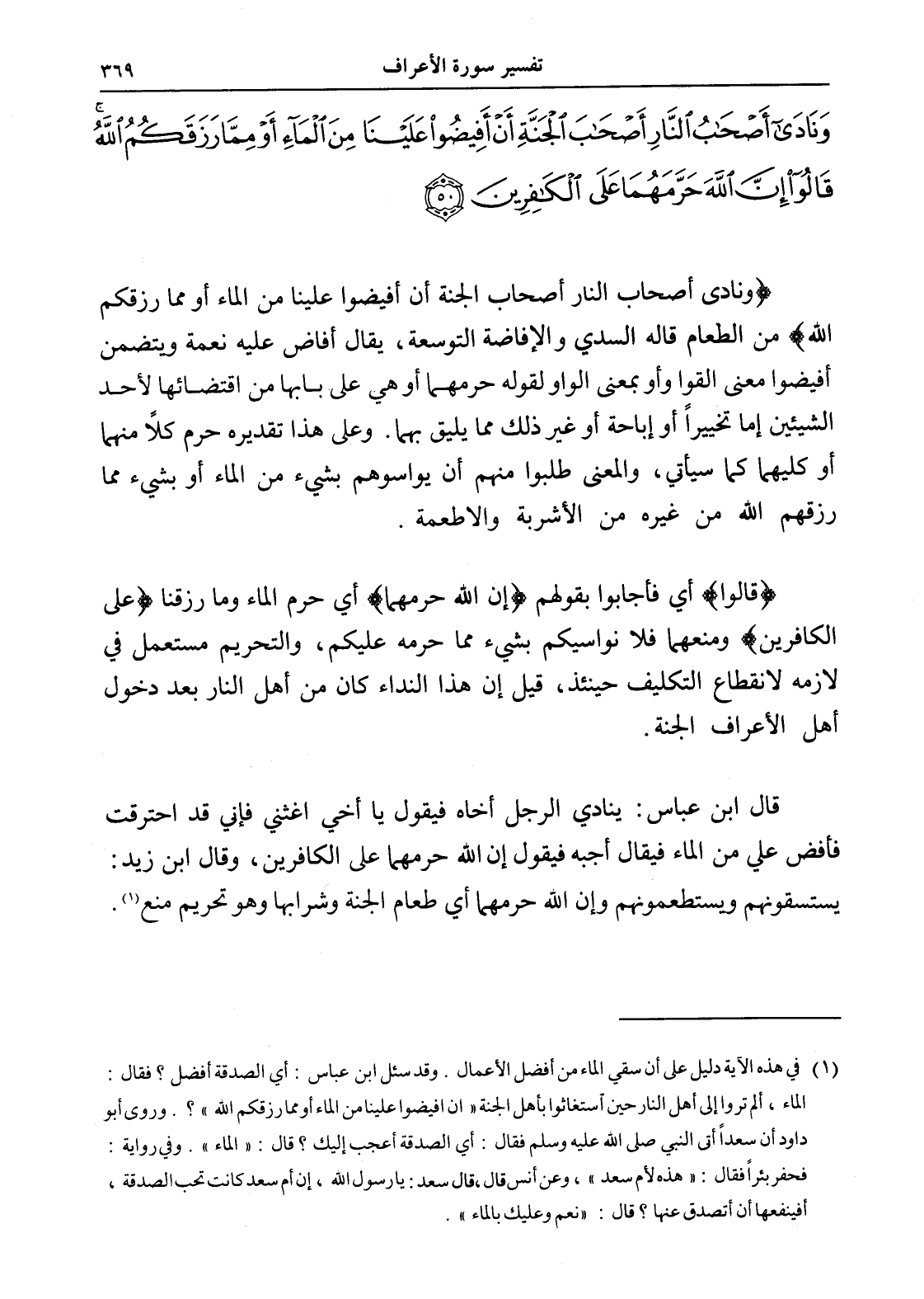 وَنَادَى أَصْحَابُ النَّارِ أَصْحَابَ الْجَنَّةِ أَنْ أَفِيضُوا عَلَيْنَا مِنَ الْمَاءِ أَوْ مِمَّا رَزَقَكُمُ اللَّهُ قَالُوا إِنَّ اللَّهَ حَرَّمَهُمَا عَلَى الْكَافِرِينَ (50)