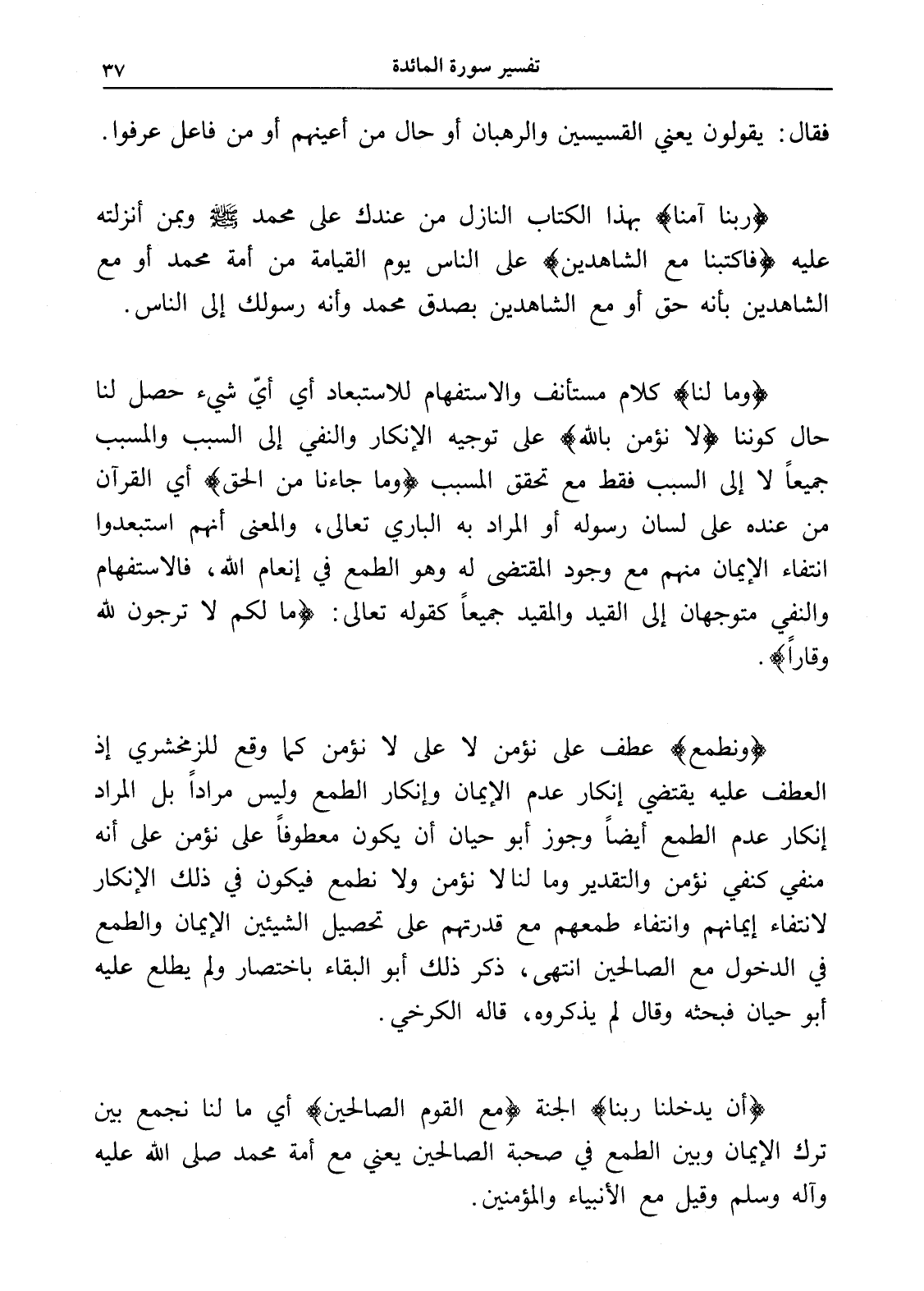 (ونطمع) عطف على نؤمن لا على لا نؤمن كما وقع للزمخشري إذ العطف عليه يقتضي إنكار عدم الإيمان وإنكار الطمع وليس مراداً بل المراد إنكار عدم الطمع أيضاً وجوز أبو حيان أن يكون معطوفاً على نؤمن على أنه منفي كنفي نؤمن والتقدير وما لنا لا نؤمن ولا نطمع فيكون في ذلك الإنكار لانتفاء إيمانهم وانتفاء طمعهم مع قدرتهم على تحصيل الشيئين الإيمان والطمع في الدخول مع الصالحين انتهى، ذكر ذلك أبو البقاء باختصار ولم يطلع عليه أبو حيان فبحثه وقال لم يذكروه، قاله الكرخي.