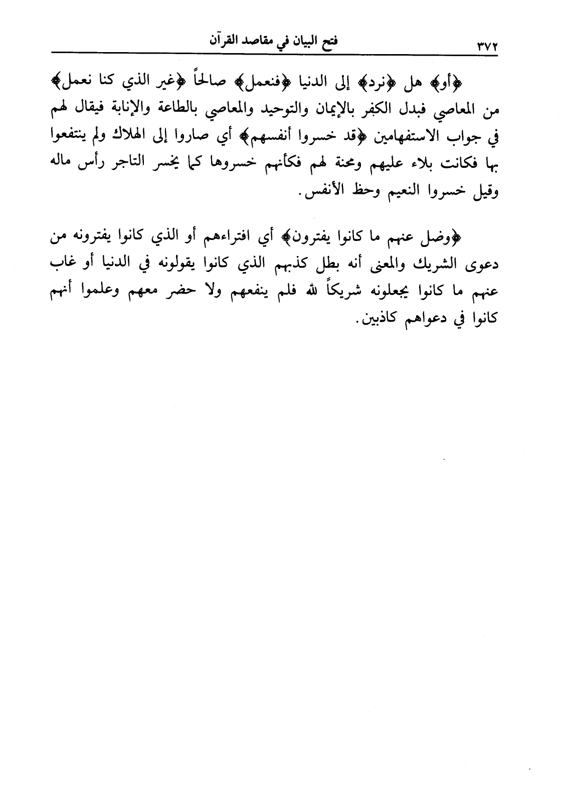 (أو) هل (نرد) إلى الدنيا (فنعمل) صالحاً (غير الذي كنا نعمل) من المعاصي فبدل الكفر بالإيمان والتوحيد والمعاصي بالطاعة والإنابة فيقال لهم في جواب الاستفهامين (قد خسروا أنفسهم) أي صاروا إلى الهلاك ولم ينتفعوا بها فكانت بلاء عليهم ومحنة لهم فكأنهم خسروها كما يخسر التاجر رأس ماله وقيل خسروا النعيم وحظ الأنفس.