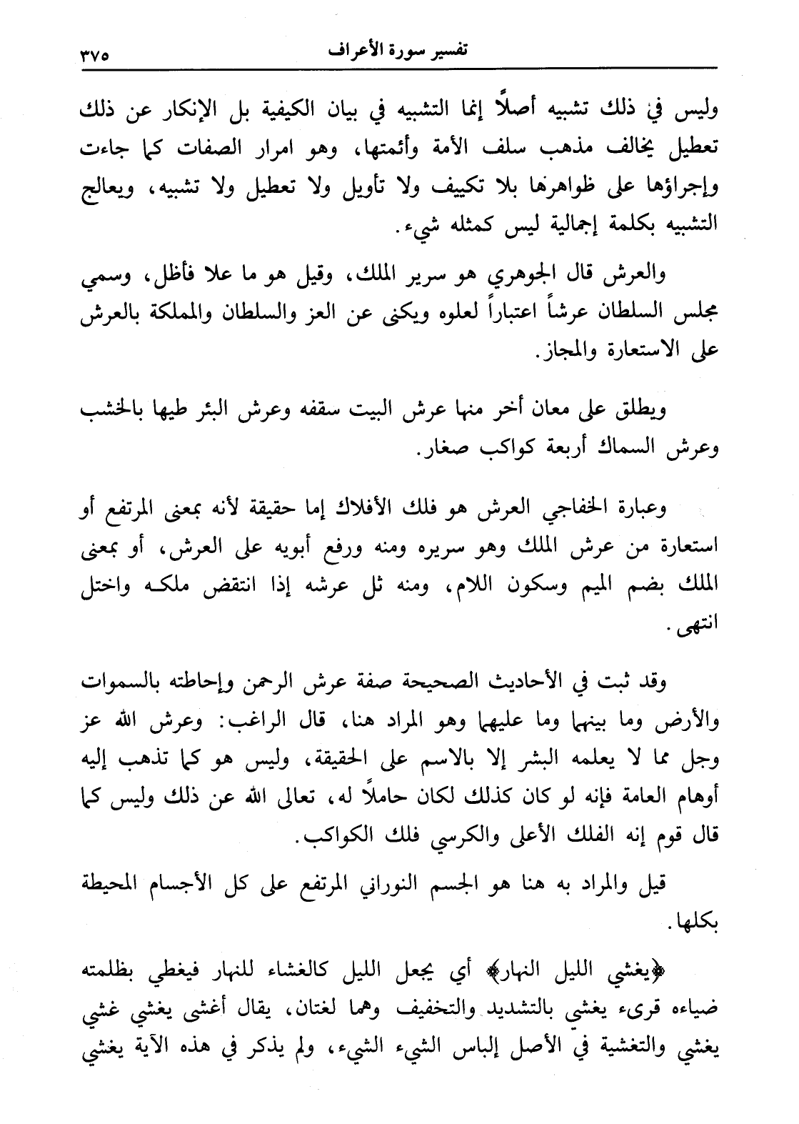 وعبارة الخفاجي العرش هو فلك الأفلاك إما حقيقة لأنه بمعنى المرتفع أو استعارة من عرش الملك وهو سريره ومنه ورفع أبويه على العرش، أو بمعنى الملك بضم الميم وسكون اللام، ومنه ثل عرشه إذا انتقض ملكه واختل انتهى.