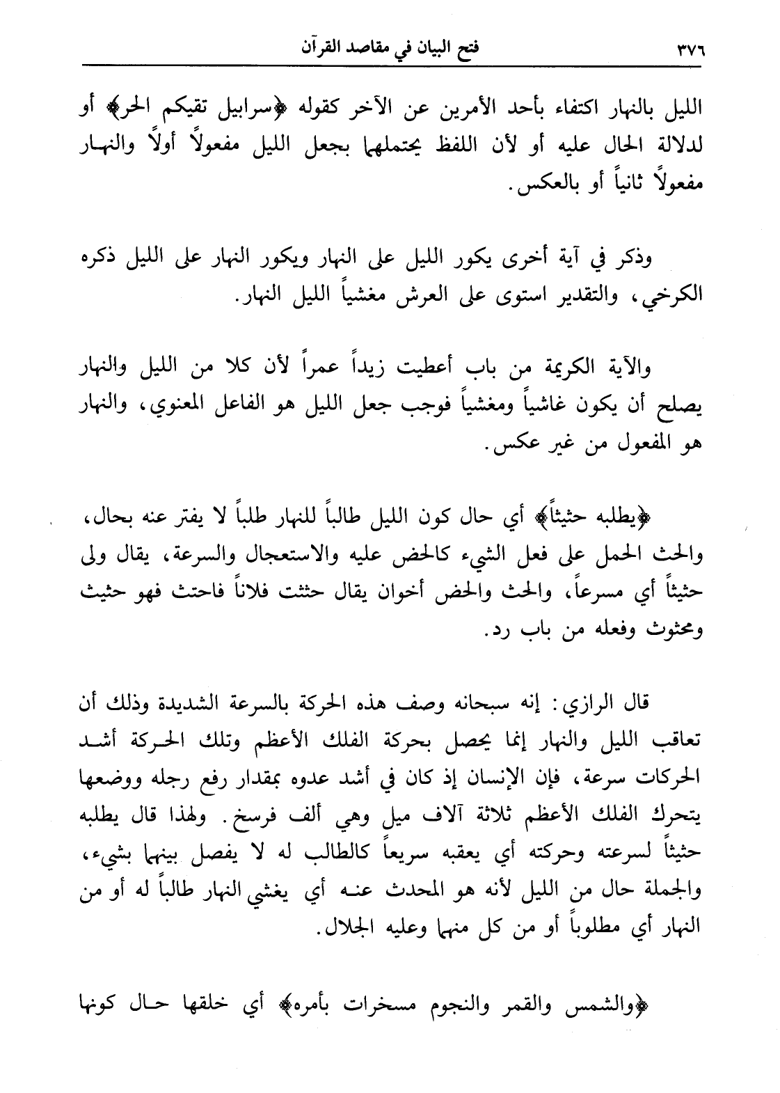 قال الرازي: إنه سبحانه وصف هذه الحركة بالسرعة الشديدة وذلك أن تعاقب الليل والنهار إنما يحصل بحركة الفلك الأعظم وتلك الحركة أشد الحركات سرعة، فإن الإنسان إذ كان في أشد عدوه بمقدار رفع رجله ووضعها يتحرك الفلك الأعظم ثلاثة آلاف ميل وهي ألف فرسخ. ولهذا قال يطلبه حثيثاً لسرعته وحركته أي يعقبه سريعاً كالطالب له لا يفصل بينهما بشيء، والجملة حال من الليل لأنه هو المحدث عنه أي يغشي النهار طالباً له أو من النهار أي مطلوباً أو من كل منهما وعليه الجلال.