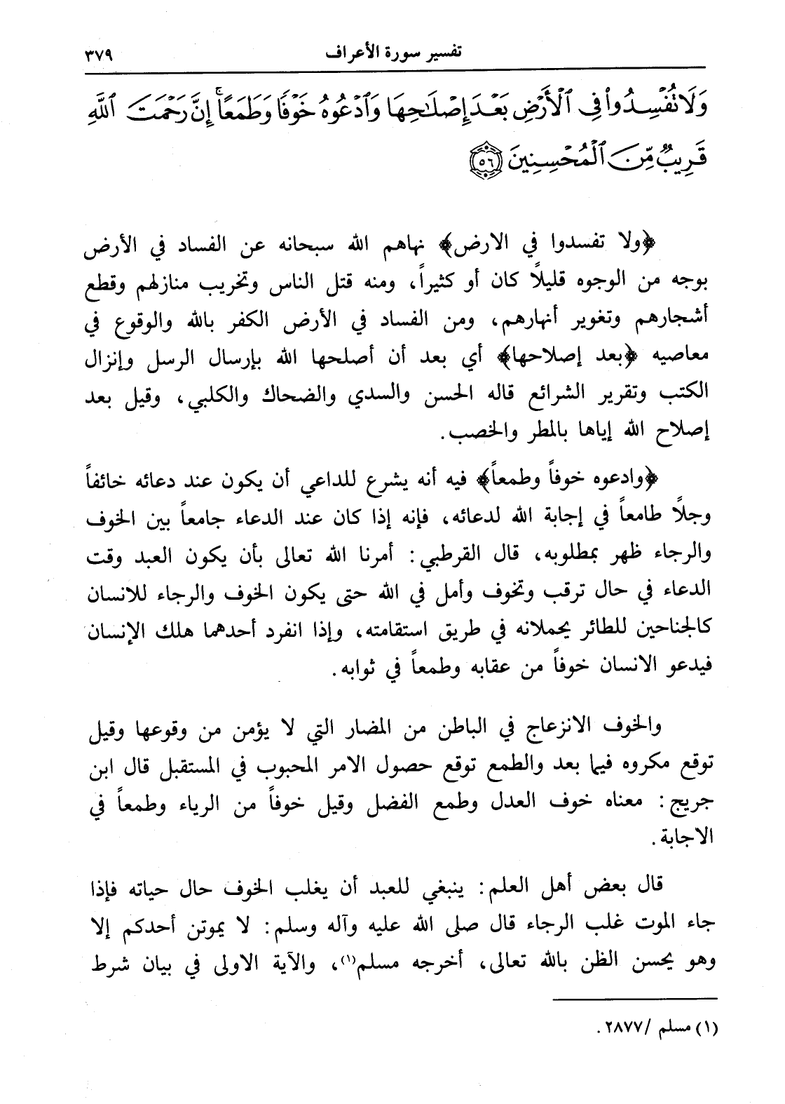 وَلَا تُفْسِدُوا فِي الْأَرْضِ بَعْدَ إِصْلَاحِهَا وَادْعُوهُ خَوْفًا وَطَمَعًا إِنَّ رَحْمَتَ اللَّهِ قَرِيبٌ مِنَ الْمُحْسِنِينَ (56)