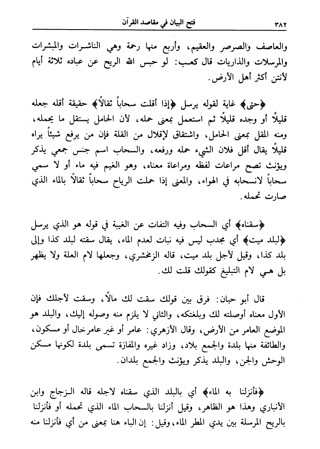 قال أبو حبان: فرق بين قولك سقت لك مالاً، وسقت لأجلك فإن الأول معناه أوصلته لك وبلغتكه، والثاني لا يلزم منه وصوله إليك، والبلد هو الموضع العامر من الأرض، وقال الأزهري: عامر أو غير عامر خال أو مسكون، والطائفة منها بلدة والجمع بلاد، وزاد غيره والمفازة تسمى بلدة لكونها مسكن الوحش والجن، والبلد يذكر ويؤنث والجمع بلدان.