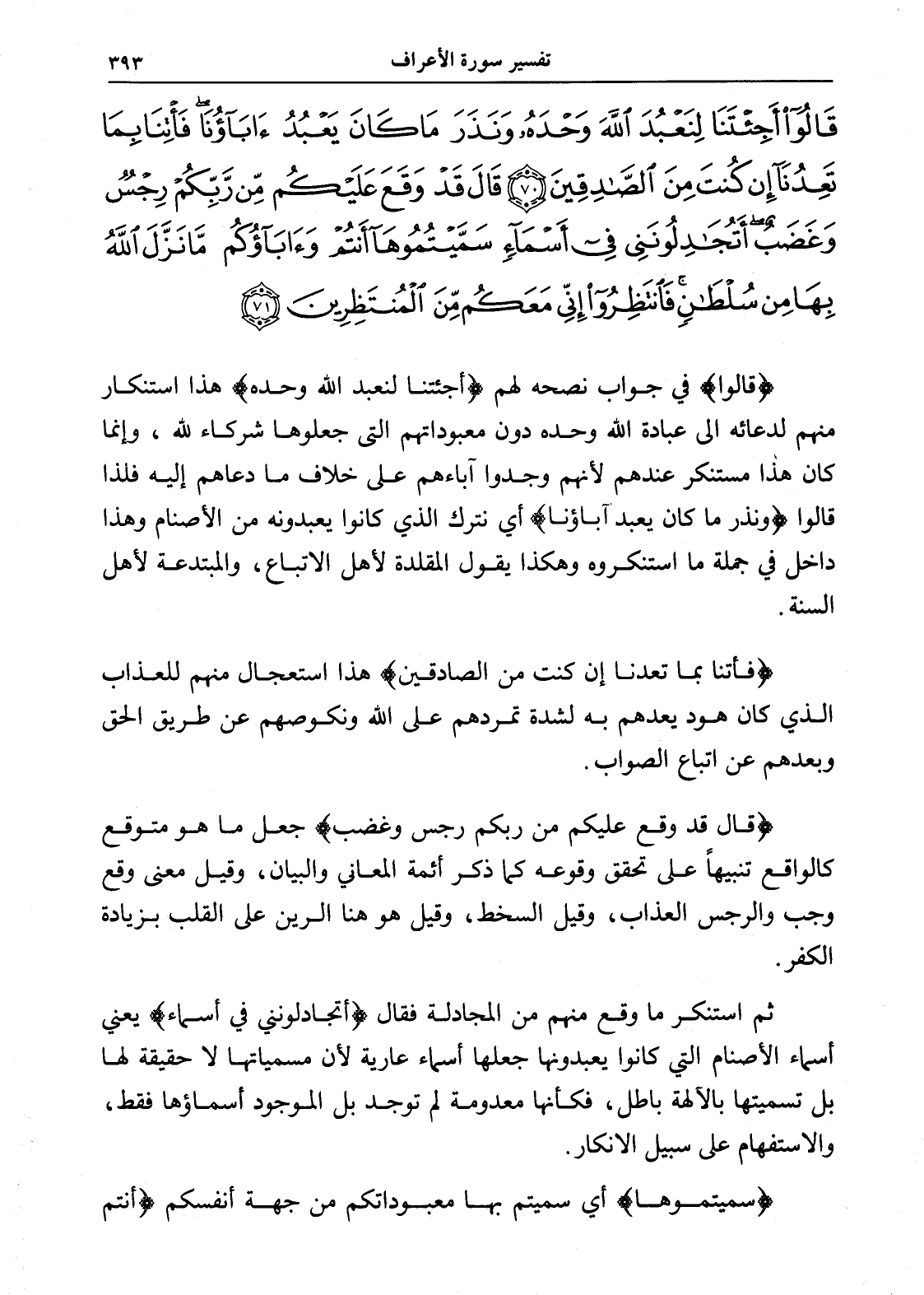 قَالُوا أَجِئْتَنَا لِنَعْبُدَ اللَّهَ وَحْدَهُ وَنَذَرَ مَا كَانَ يَعْبُدُ آبَاؤُنَا فَأْتِنَا بِمَا تَعِدُنَا إِنْ كُنْتَ مِنَ الصَّادِقِينَ (70) قَالَ قَدْ وَقَعَ عَلَيْكُمْ مِنْ رَبِّكُمْ رِجْسٌ وَغَضَبٌ أَتُجَادِلُونَنِي فِي أَسْمَاءٍ سَمَّيْتُمُوهَا أَنْتُمْ وَآبَاؤُكُمْ مَا نَزَّلَ اللَّهُ بِهَا مِنْ سُلْطَانٍ فَانْتَظِرُوا إِنِّي مَعَكُمْ مِنَ الْمُنْتَظِرِينَ (71)