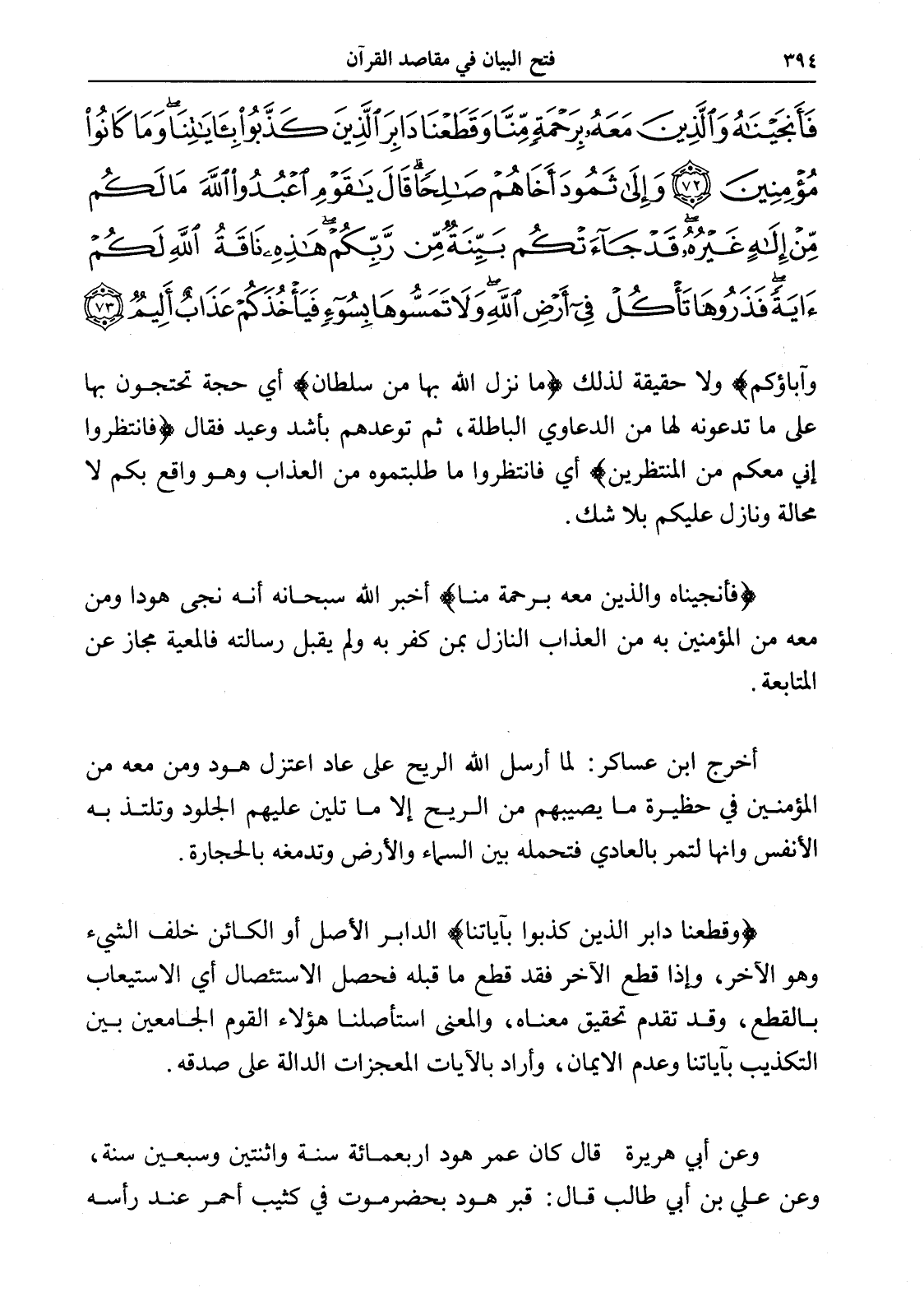 فَأَنْجَيْنَاهُ وَالَّذِينَ مَعَهُ بِرَحْمَةٍ مِنَّا وَقَطَعْنَا دَابِرَ الَّذِينَ كَذَّبُوا بِآيَاتِنَا وَمَا كَانُوا مُؤْمِنِينَ (72) وَإِلَى ثَمُودَ أَخَاهُمْ صَالِحًا قَالَ يَا قَوْمِ اعْبُدُوا اللَّهَ مَا لَكُمْ مِنْ إِلَهٍ غَيْرُهُ قَدْ جَاءَتْكُمْ بَيِّنَةٌ مِنْ رَبِّكُمْ هَذِهِ نَاقَةُ اللَّهِ لَكُمْ آيَةً فَذَرُوهَا تَأْكُلْ فِي أَرْضِ اللَّهِ وَلَا تَمَسُّوهَا بِسُوءٍ فَيَأْخُذَكُمْ عَذَابٌ أَلِيمٌ (73)