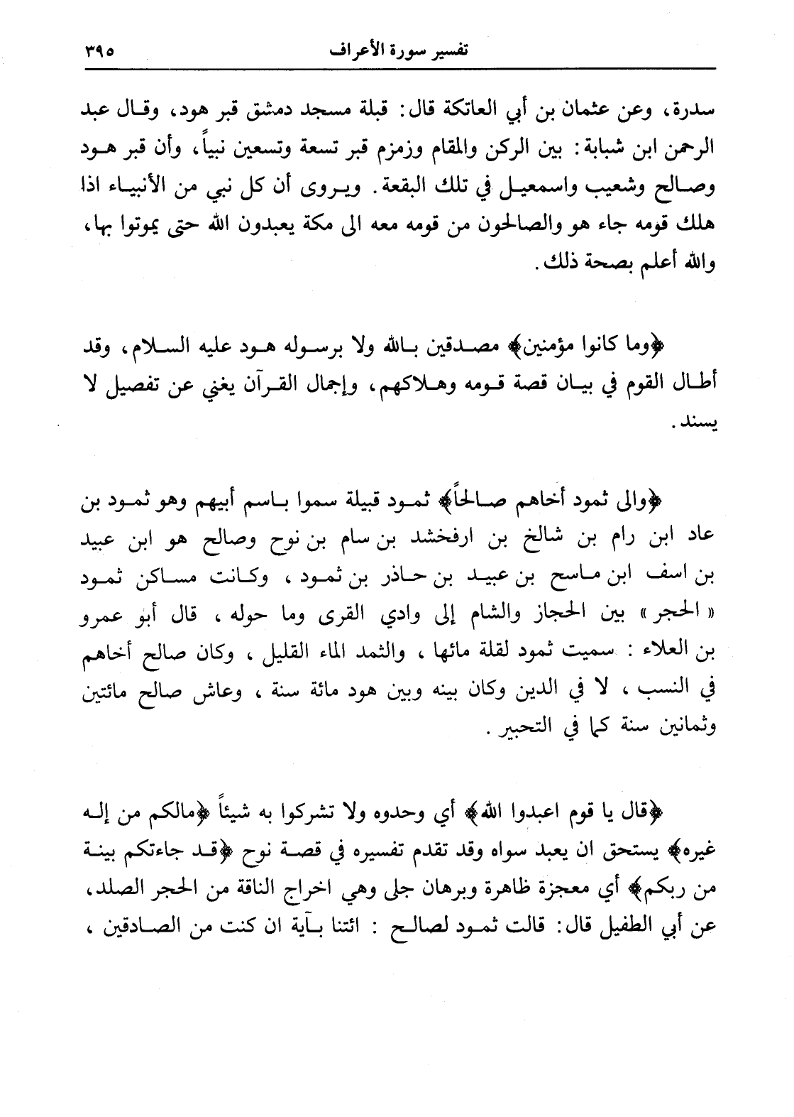 (وإلى ثمود أخاهم صالحاً) ثمود قبيلة سموا باسم أبيهم وهو ثمود بن عاد ابن رام بن شالخ بن أرفخشد بن سام بن نوح وصالح هو ابن عبيد بن اسف ابن ماسح بن عبيد بن حاذر بن ثمود، وكانت مساكن ثمود " الحجر " بين الحجاز والشام إلى وادي القرى وما حوله، قال أبو عمرو بن العلاء: سميت ثمود لقلة مائها، والثمد الماء القليل، وكان صالح أخاهم في النسب، لا في الدين وكان بينه وبين هود مائة سنة، وعاش صالح مائتين وثمانين سنة كما في التحبير.