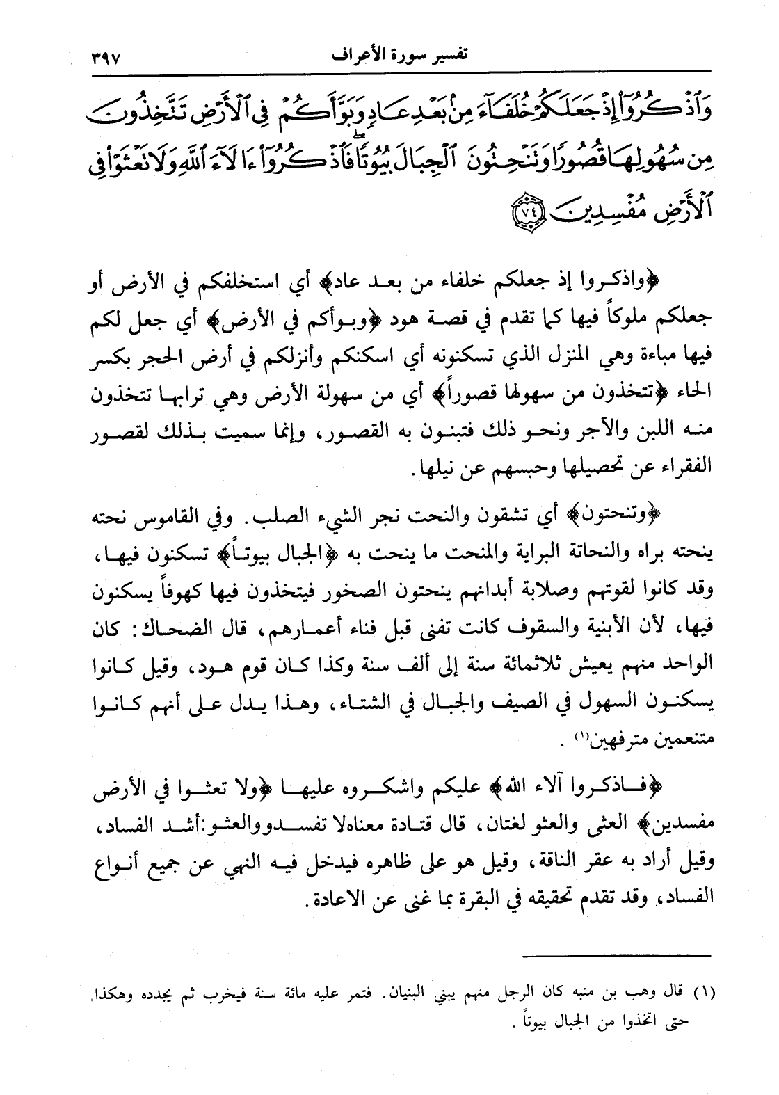 وَاذْكُرُوا إِذْ جَعَلَكُمْ خُلَفَاءَ مِنْ بَعْدِ عَادٍ وَبَوَّأَكُمْ فِي الْأَرْضِ تَتَّخِذُونَ مِنْ سُهُولِهَا قُصُورًا وَتَنْحِتُونَ الْجِبَالَ بُيُوتًا فَاذْكُرُوا آلَاءَ اللَّهِ وَلَا تَعْثَوْا فِي الْأَرْضِ مُفْسِدِينَ (74)