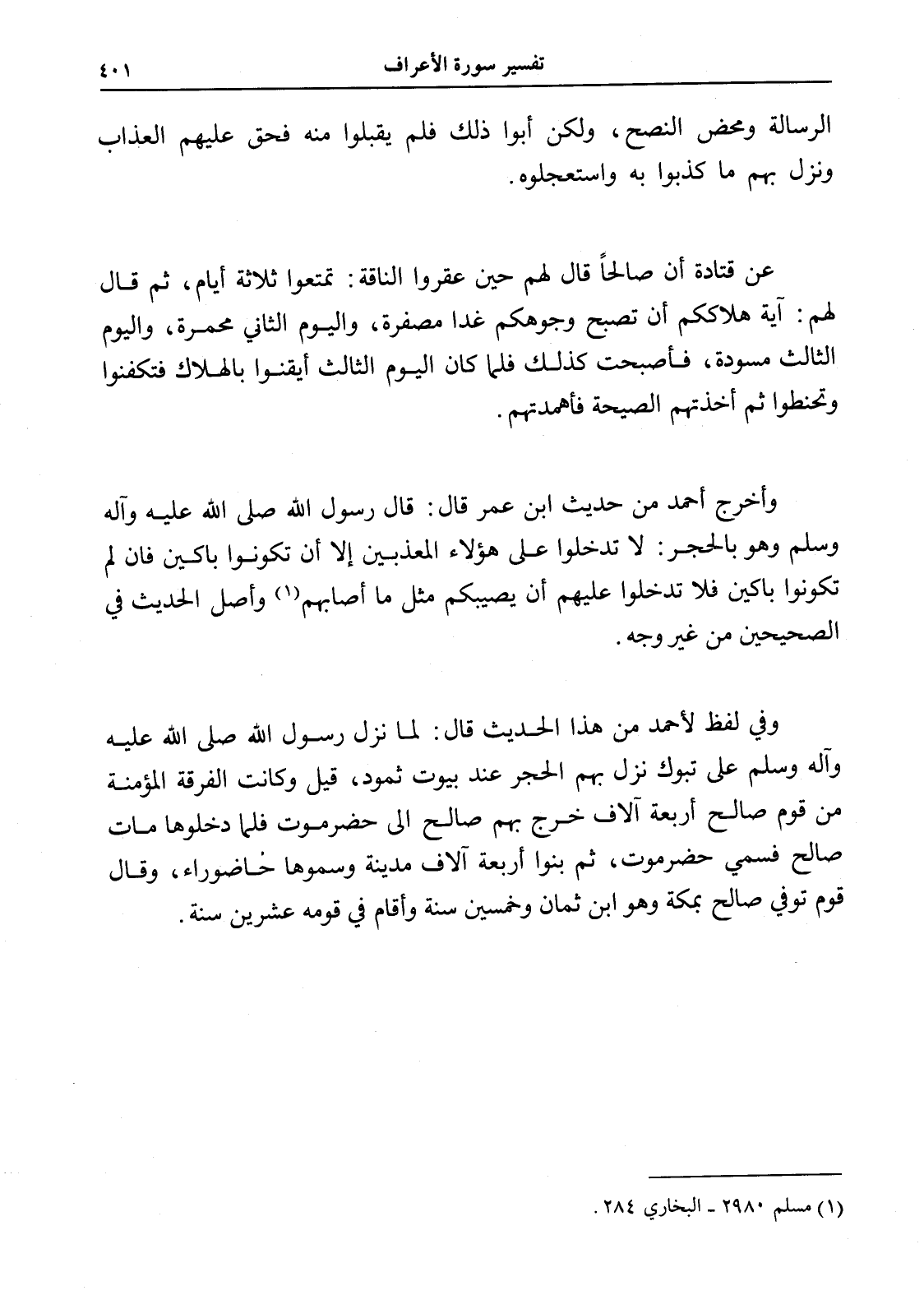 وفي لفظ لأحمد من هذا الحديث قال: لما نزل رسول الله صلى الله عليه وآله وسلم على تبوك نزل بهم الحجر عند بيوت ثمود، قيل وكانت الفرقة المؤمنة من قوم صالح أربعة آلاف خرج بهم صالح إلى حضر موت فلما دخلوها مات صالح فسمي حضر موت، ثم بنوا أربعة آلاف مدينة وسموها حاضوراء، وقال قوم توفي صالح بمكة وهو ابن ثمان وخمسين سنة وأقام في قومه عشرين سنة.