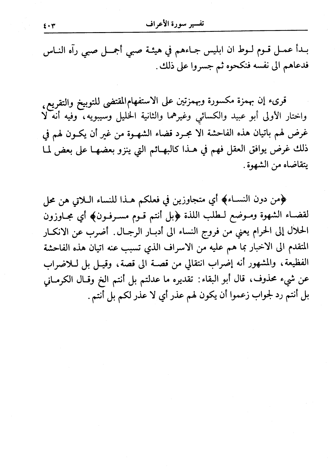 (من دون النساء) أي متجاوزين في فعلكم هذا للنساء اللاتي هن محل لقضاء الشهوة وموضع لطلب اللذة (بل أنتم قوم مسرفون) أي مجاوزون الحلال إلى الحرام يعني من فروج النساء إلى أدبار الرجال. أضرب عن الإنكار المتقدم إلى الإخبار بما هم عليه من الإسراف الذي تسبب عنه إتيان هذه الفاحشة الفظيعة، والمشهور أنه إضراب انتقالي من قصة إلى قصة، وقيل بل للإضراب عن شيء محذوف، قال أبو البقاء: تقديره ما عدلتم بل أنتم الخ وقال الكرماني بل أنتم رد لجواب زعموا أن يكون لهم عذر أي لا عذر لكم بل أنتم.