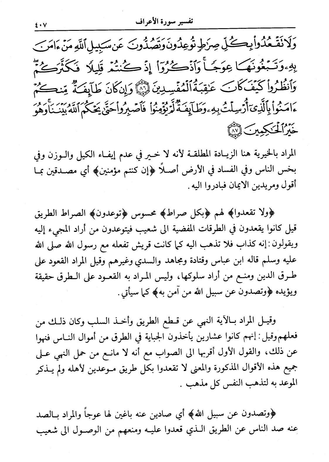 وَلَا تَقْعُدُوا بِكُلِّ صِرَاطٍ تُوعِدُونَ وَتَصُدُّونَ عَنْ سَبِيلِ اللَّهِ مَنْ آمَنَ بِهِ وَتَبْغُونَهَا عِوَجًا وَاذْكُرُوا إِذْ كُنْتُمْ قَلِيلاً فَكَثَّرَكُمْ وَانْظُرُوا كَيْفَ كَانَ عَاقِبَةُ الْمُفْسِدِينَ (86) وَإِنْ كَانَ طَائِفَةٌ مِنْكُمْ آمَنُوا بِالَّذِي أُرْسِلْتُ بِهِ وَطَائِفَةٌ لَمْ يُؤْمِنُوا فَاصْبِرُوا حَتَّى يَحْكُمَ اللَّهُ بَيْنَنَا وَهُوَ خَيْرُ الْحَاكِمِينَ (87)