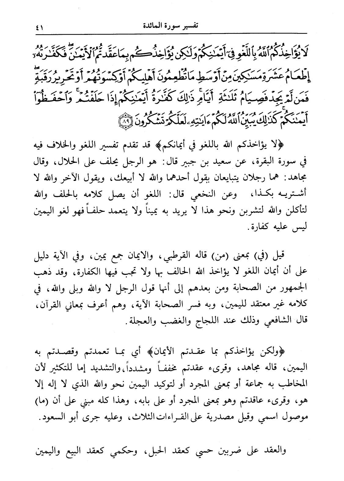 لَا يُؤَاخِذُكُمُ اللَّهُ بِاللَّغْوِ فِي أَيْمَانِكُمْ وَلَكِنْ يُؤَاخِذُكُمْ بِمَا عَقَّدْتُمُ الْأَيْمَانَ فَكَفَّارَتُهُ إِطْعَامُ عَشَرَةِ مَسَاكِينَ مِنْ أَوْسَطِ مَا تُطْعِمُونَ أَهْلِيكُمْ أَوْ كِسْوَتُهُمْ أَوْ تَحْرِيرُ رَقَبَةٍ فَمَنْ لَمْ يَجِدْ فَصِيَامُ ثَلَاثَةِ أَيَّامٍ ذَلِكَ كَفَّارَةُ أَيْمَانِكُمْ إِذَا حَلَفْتُمْ وَاحْفَظُوا أَيْمَانَكُمْ كَذَلِكَ يُبَيِّنُ اللَّهُ لَكُمْ آيَاتِهِ لَعَلَّكُمْ تَشْكُرُونَ (89)