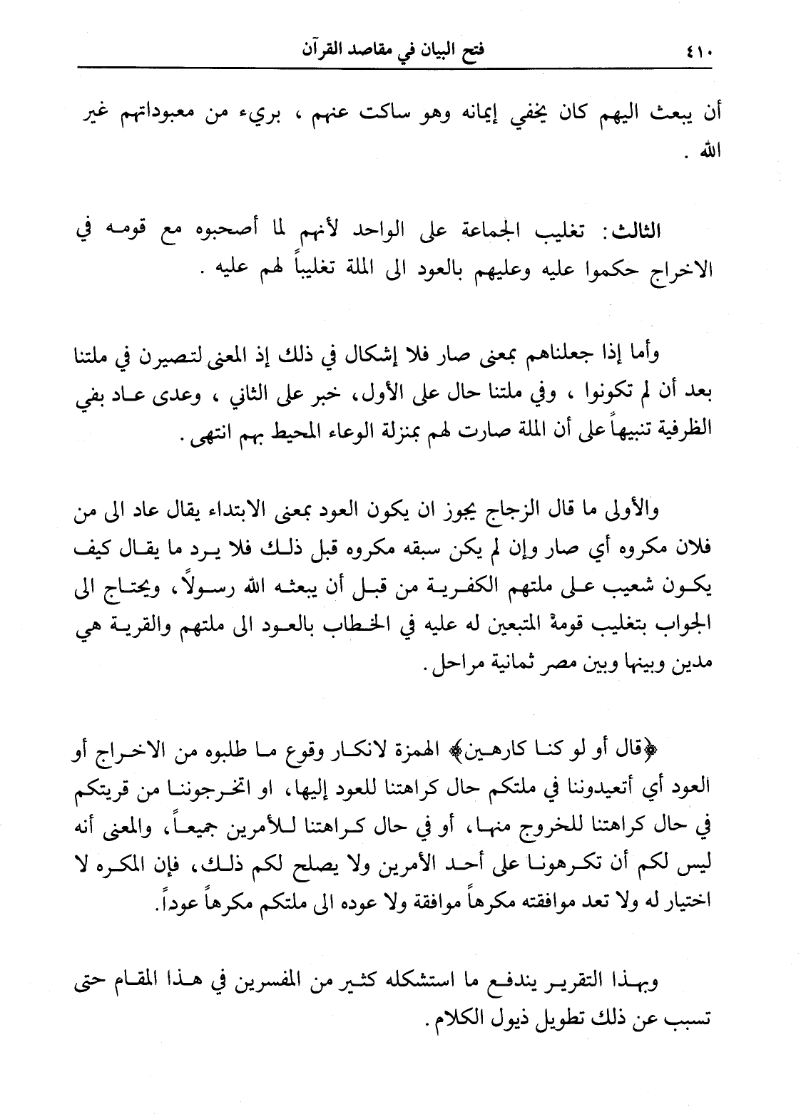الثالث: تغليب الجماعة على الواحد لأنهم لما أصحبوه مع قومه في الإخراج حكموا عليه وعليهم بالعود إلى الملة تغليباً لهم عليه.