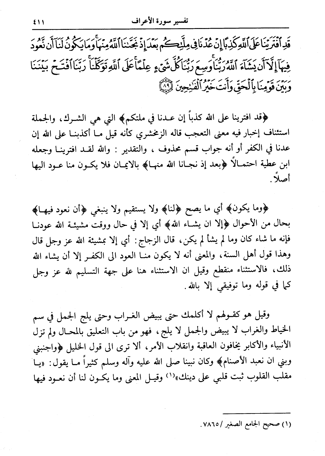 قَدِ افْتَرَيْنَا عَلَى اللَّهِ كَذِبًا إِنْ عُدْنَا فِي مِلَّتِكُمْ بَعْدَ إِذْ نَجَّانَا اللَّهُ مِنْهَا وَمَا يَكُونُ لَنَا أَنْ نَعُودَ فِيهَا إِلَّا أَنْ يَشَاءَ اللَّهُ رَبُّنَا وَسِعَ رَبُّنَا كُلَّ شَيْءٍ عِلْمًا عَلَى اللَّهِ تَوَكَّلْنَا رَبَّنَا افْتَحْ بَيْنَنَا وَبَيْنَ قَوْمِنَا بِالْحَقِّ وَأَنْتَ خَيْرُ الْفَاتِحِينَ (89)