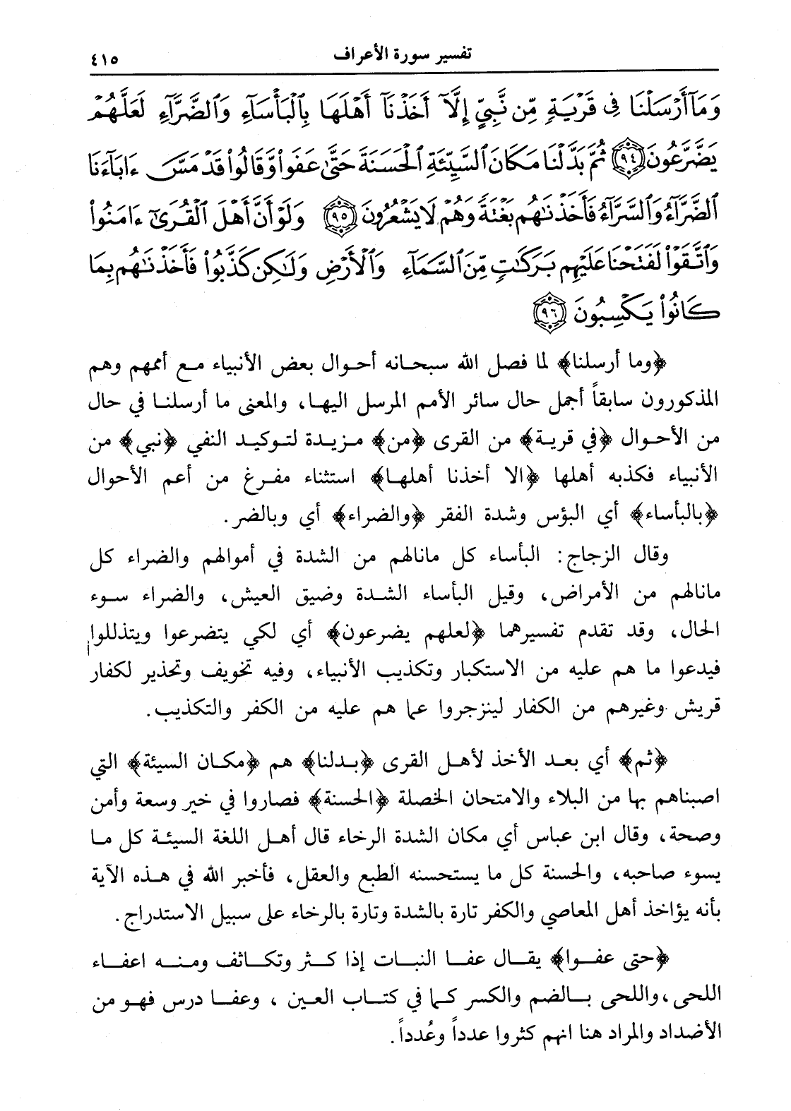 وَمَا أَرْسَلْنَا فِي قَرْيَةٍ مِنْ نَبِيٍّ إِلَّا أَخَذْنَا أَهْلَهَا بِالْبَأْسَاءِ وَالضَّرَّاءِ لَعَلَّهُمْ يَضَّرَّعُونَ (94) ثُمَّ بَدَّلْنَا مَكَانَ السَّيِّئَةِ الْحَسَنَةَ حَتَّى عَفَوْا وَقَالُوا قَدْ مَسَّ آبَاءَنَا الضَّرَّاءُ وَالسَّرَّاءُ فَأَخَذْنَاهُمْ بَغْتَةً وَهُمْ لَا يَشْعُرُونَ (95) وَلَوْ أَنَّ أَهْلَ الْقُرَى آمَنُوا وَاتَّقَوْا لَفَتَحْنَا عَلَيْهِمْ بَرَكَاتٍ مِنَ السَّمَاءِ وَالْأَرْضِ وَلَكِنْ كَذَّبُوا فَأَخَذْنَاهُمْ بِمَا كَانُوا يَكْسِبُونَ (96)