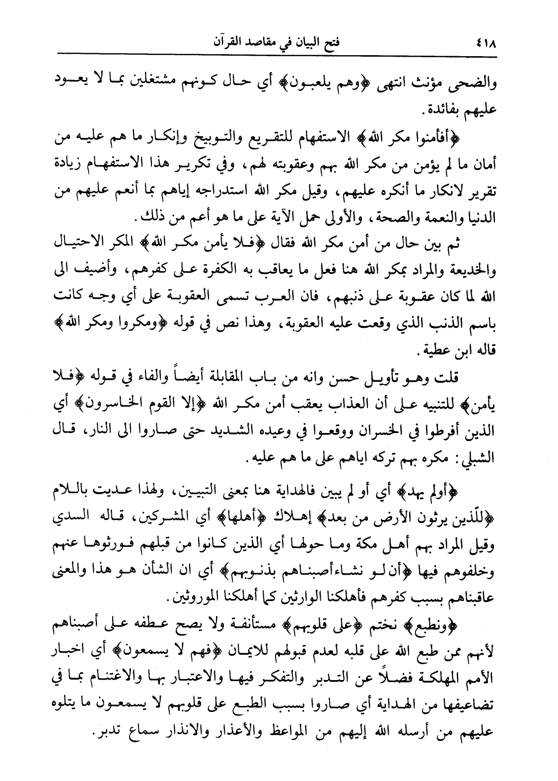 قلت وهو تأويل حسن وأنه من باب المقابلة أيضاً والفاء في قوله (فلا يأمن) للتنبيه على أن العذاب يعقب أمن مكر الله (إلا القوم الخاسرون) أي الذين أفرطوا في الخسران ووقعوا في وعيده الشديد حتى صاروا إلى النار، قال الشبلي: مكره بهم تركه إياهم على ما هم عليه.