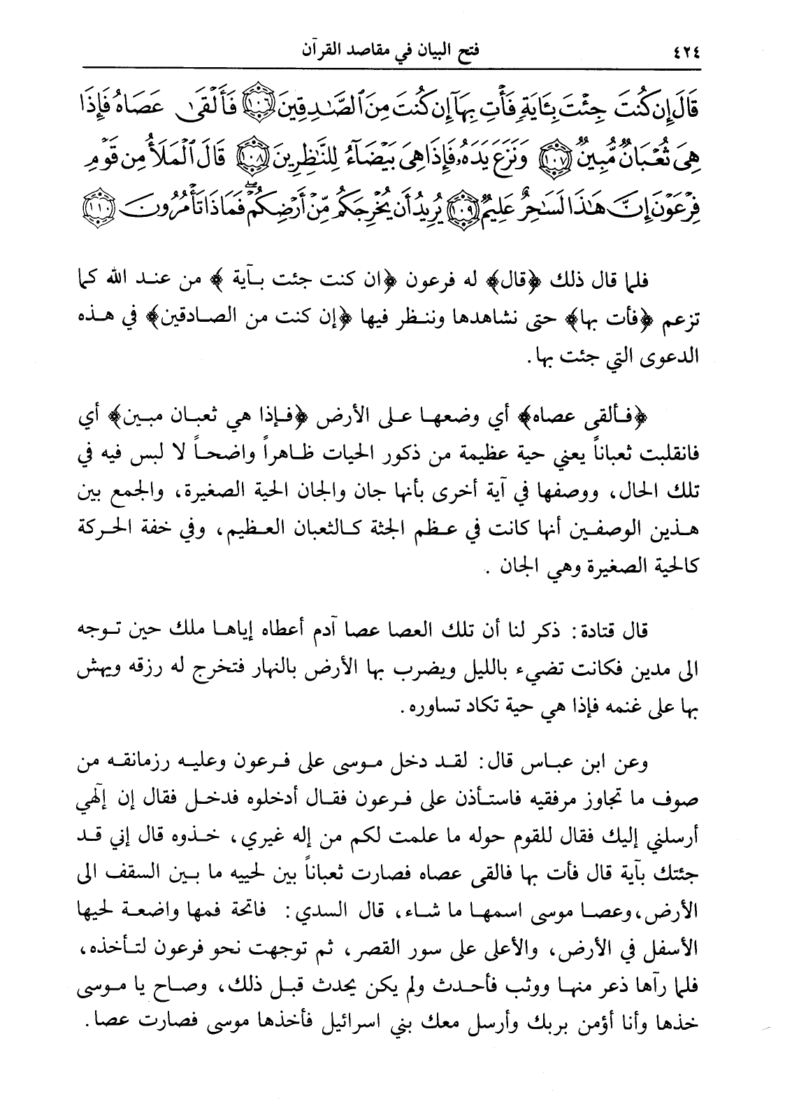 (فألقى عصاه) أي وضعها على الأرض (فإذا هي ثعبان مبين) أي فانقلبت ثعباناً يعني حية عظيمة من ذكور الحيات ظاهراً واضحاً لا لبس فيه في تلك الحال، ووصفها في آية أخرى بأنها جان والجان الحية الصغيرة، والجمع بين هذين الوصفين أنها كانت في عظم الجثة كالثعبان العظيم، وفي خفة الحركة كالحية الصغيرة وهي الجان.