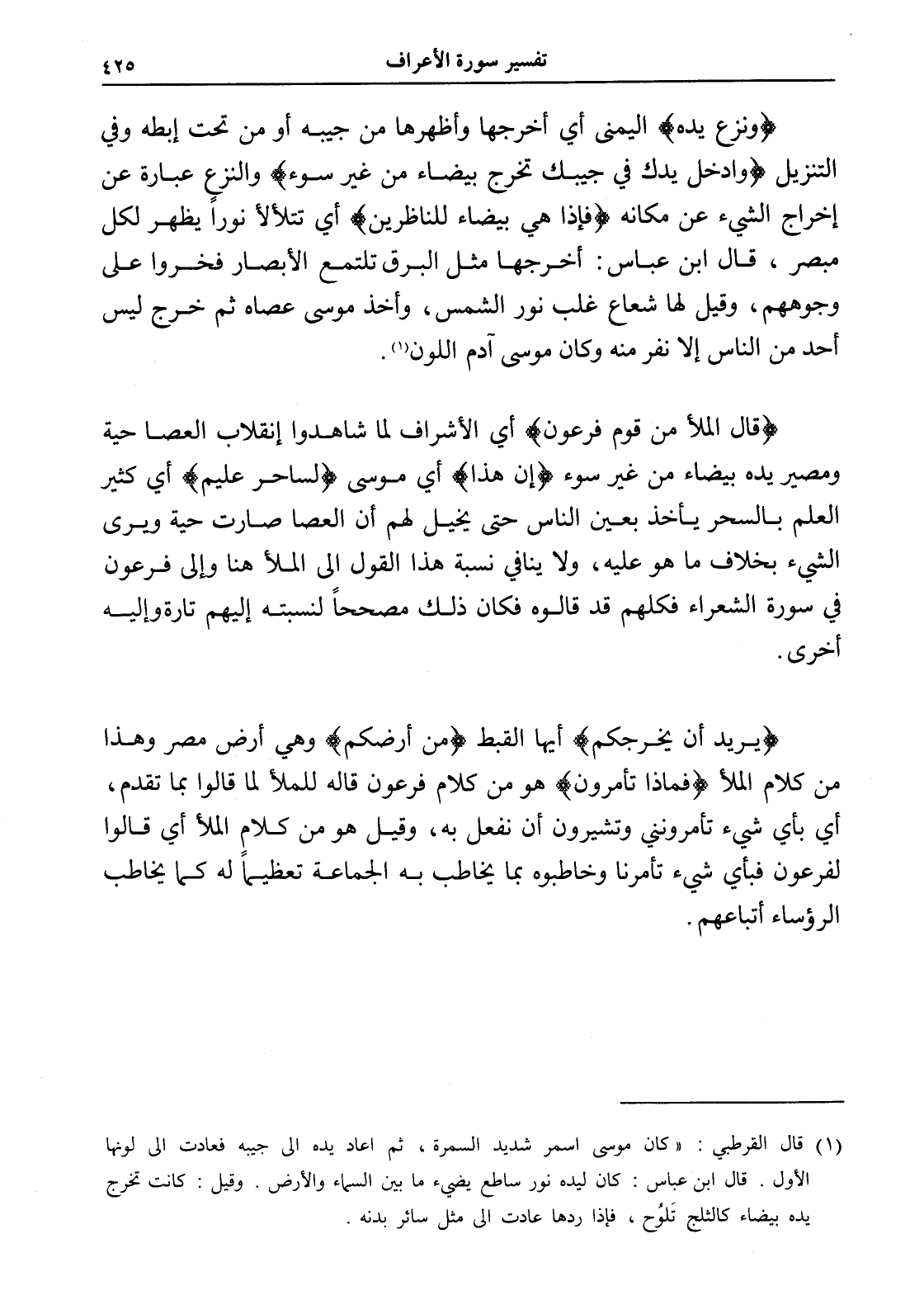 (¬1) قال القرطبي: " كان موسى أسمر شديد السمرة، ثم أعاد يده إلى جيبه فعادت إلى لونها الأول. قال ابن عباس: كان ليده نور ساطع يضيء ما بين السماء والأرض. وقيل: كانت تخرج يده بيضاء كالثلج تَلوُح، فإذا ردها عادت إلى مثل سائر بدنه.