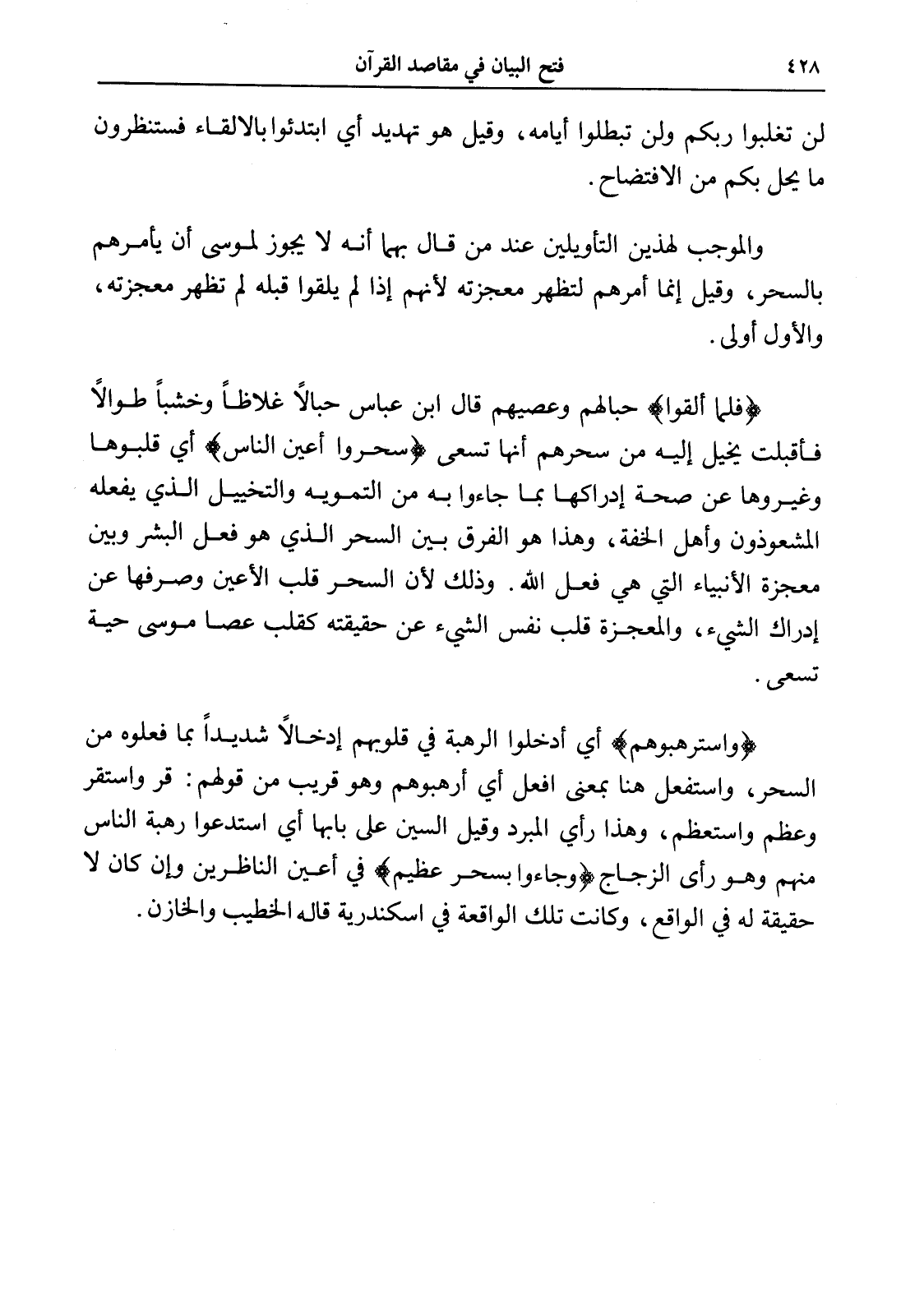 (فلما ألقوا) حبالهم وعصيهم قال ابن عباس حبالاً غلاظاً وخشباً طوالاً فأقبلت يخيل إليه من سحرهم أنها تسعى (سحروا أعين الناس) أي قلبوها وغيروها عن صحة إدراكها بما جاءوا به من التمويه والتخييل الذي يفعله المشعوذون وأهل الخفة، وهذا هو الفرق بين السحر الذي هو فعل البشر وبين معجزة الأنبياء التي هي فعل الله. وذلك لأن السحر قلب الأعين وصرفها عن إدراك الشيء، والعجزة قلب نفس الشيء عن حقيقته كقلب عصا موسى حية تسعى.