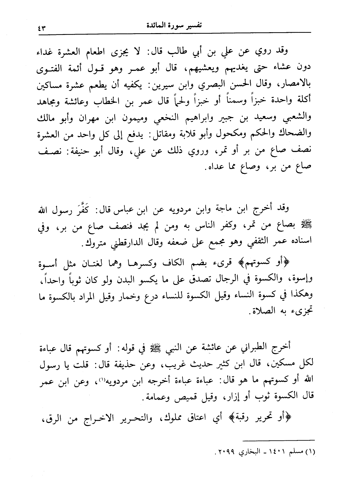 (أو كسوتهم) قرئ بضم الكاف وكسرها وهما لغتان مثل أسوة وإسوة، والكسوة في الرجال تصدق على ما يكسو البدن ولو كان ثوباً واحداً، وهكذا في كسوة النساء وقيل الكسوة للنساء درع وخمار وقيل المراد بالكسوة ما تجزئ به الصلاة.
