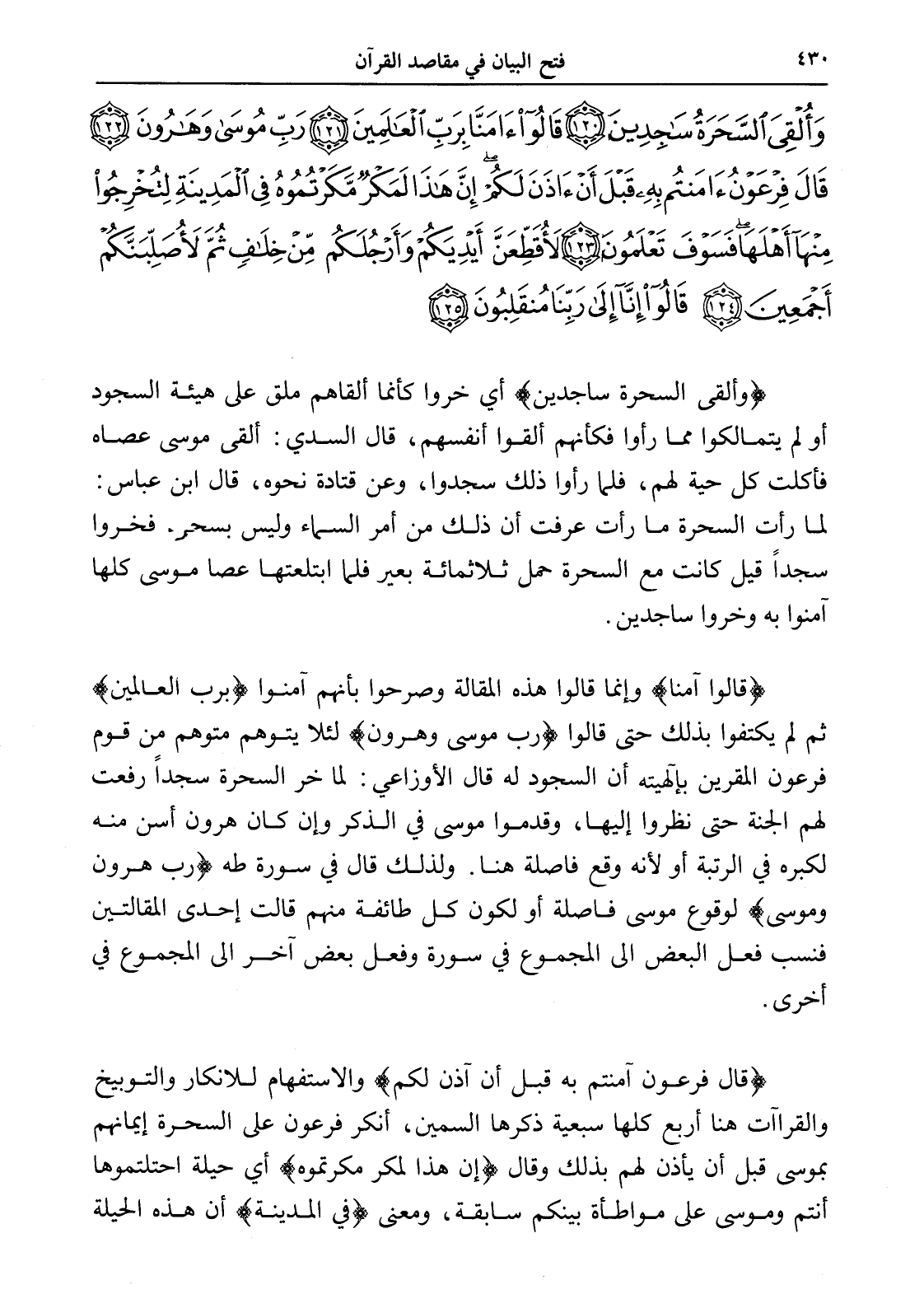 وَأُلْقِيَ السَّحَرَةُ سَاجِدِينَ (120) قَالُوا آمَنَّا بِرَبِّ الْعَالَمِينَ (121) رَبِّ مُوسَى وَهَارُونَ (122) قَالَ فِرْعَوْنُ آمَنْتُمْ بِهِ قَبْلَ أَنْ آذَنَ لَكُمْ إِنَّ هَذَا لَمَكْرٌ مَكَرْتُمُوهُ فِي الْمَدِينَةِ لِتُخْرِجُوا مِنْهَا أَهْلَهَا فَسَوْفَ تَعْلَمُونَ (123) لَأُقَطِّعَنَّ أَيْدِيَكُمْ وَأَرْجُلَكُمْ مِنْ خِلَافٍ ثُمَّ لَأُصَلِّبَنَّكُمْ أَجْمَعِينَ (124) قَالُوا إِنَّا إِلَى رَبِّنَا مُنْقَلِبُونَ (125)