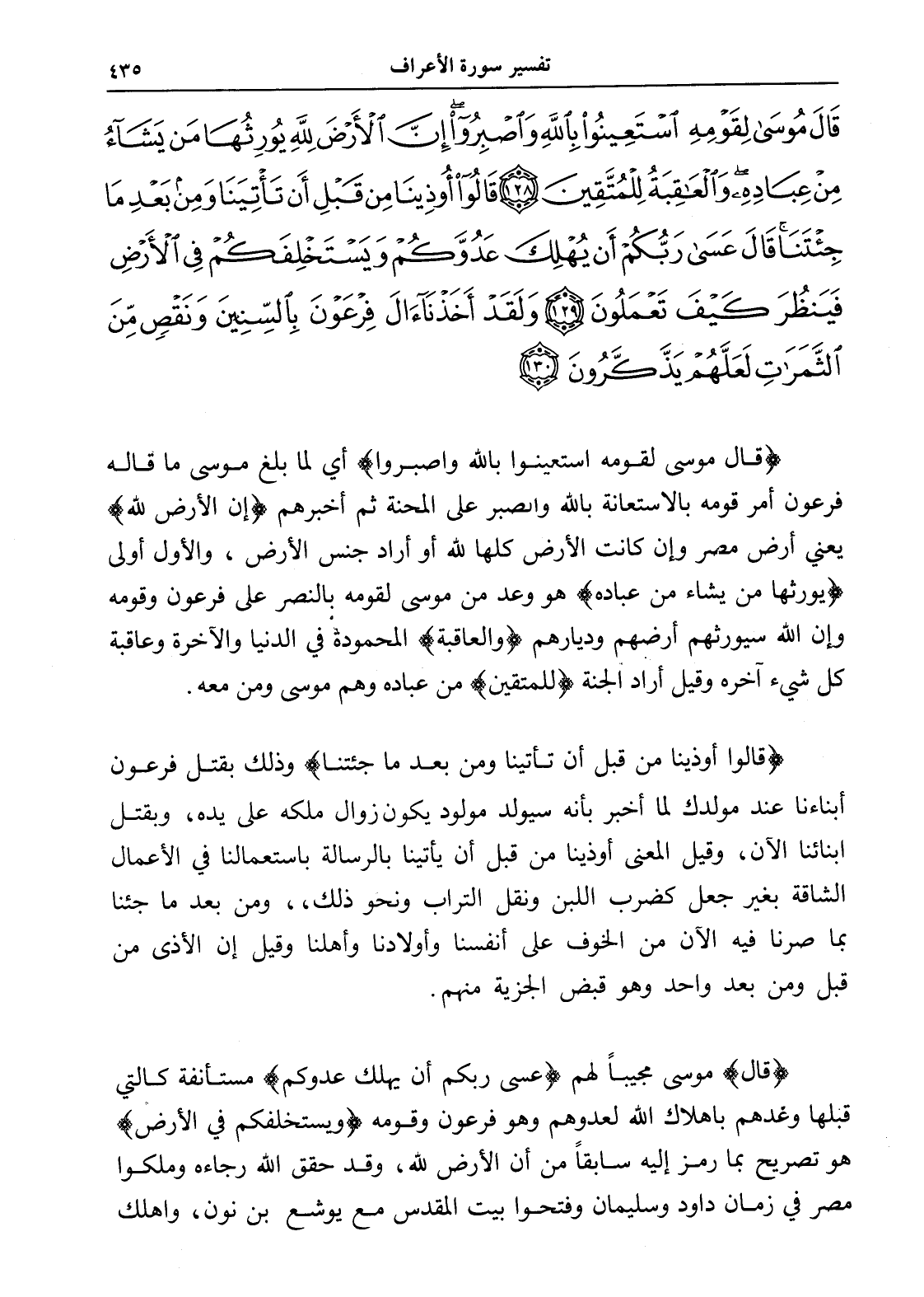 قَالَ مُوسَى لِقَوْمِهِ اسْتَعِينُوا بِاللَّهِ وَاصْبِرُوا إِنَّ الْأَرْضَ لِلَّهِ يُورِثُهَا مَنْ يَشَاءُ مِنْ عِبَادِهِ وَالْعَاقِبَةُ لِلْمُتَّقِينَ (128) قَالُوا أُوذِينَا مِنْ قَبْلِ أَنْ تَأْتِيَنَا وَمِنْ بَعْدِ مَا جِئْتَنَا قَالَ عَسَى رَبُّكُمْ أَنْ يُهْلِكَ عَدُوَّكُمْ وَيَسْتَخْلِفَكُمْ فِي الْأَرْضِ فَيَنْظُرَ كَيْفَ تَعْمَلُونَ (129) وَلَقَدْ أَخَذْنَا آلَ فِرْعَوْنَ بِالسِّنِينَ وَنَقْصٍ مِنَ الثَّمَرَاتِ لَعَلَّهُمْ يَذَّكَّرُونَ (130)