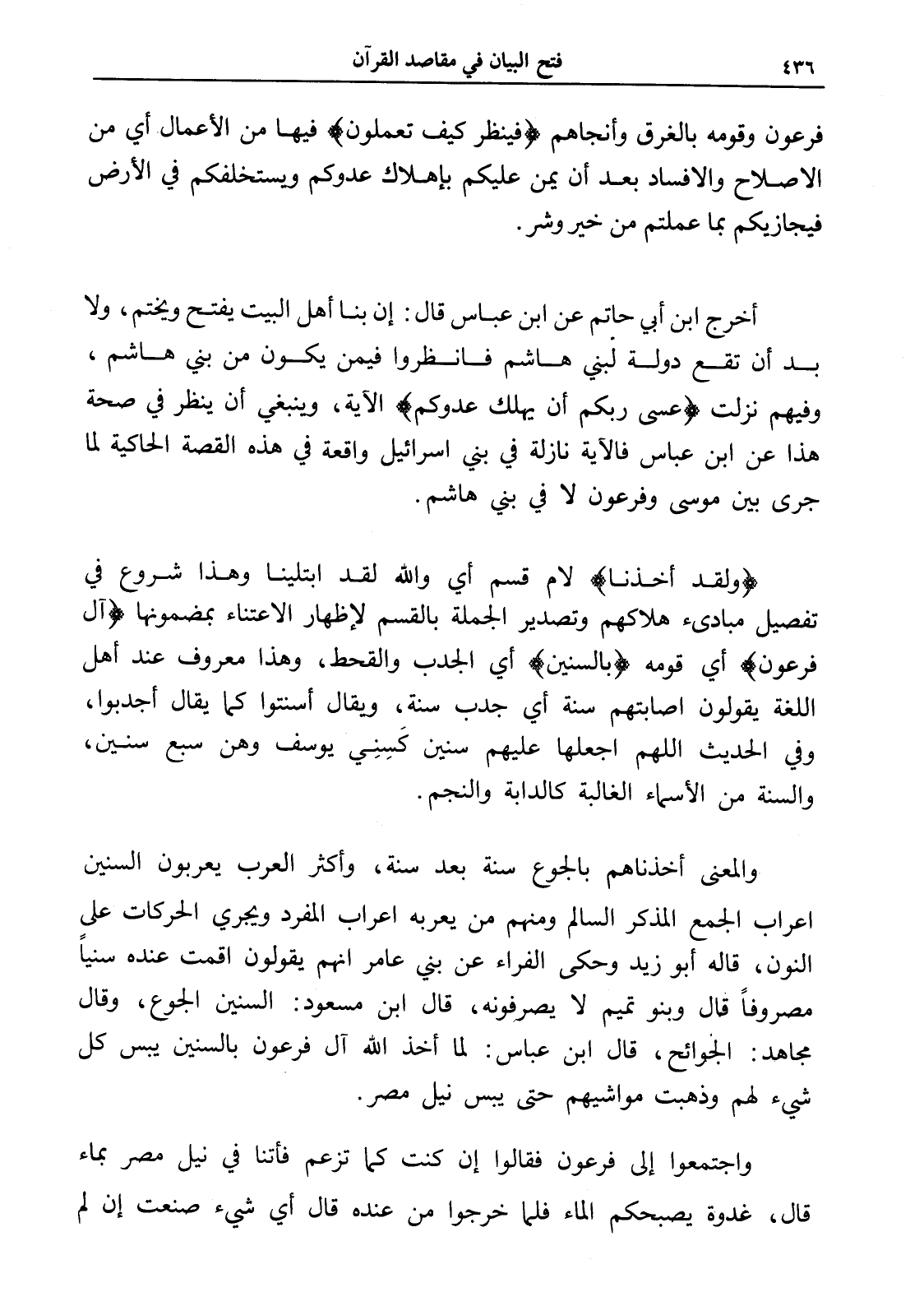 والمعنى أخذناهم بالجوع سنة بعد سنة، وأكثر العرب يعربون السنين إعراب الجمع المذكر السالم ومنهم من يعربه إعراب المفرد ويجري الحركات على النون، قاله أبو زيد وحكى الفراء عن بني عامر أنهم يقولون أقمت عنده سنياً مصروفاً قال وبنو تميم لا يصرفونه، قال ابن مسعود: السنين الجوع، وقال مجاهد: الجوائح، قال ابن عباس: لما أخذ الله آل فرعون بالسنين يبس كل شيء لهم وذهبت مواشيهم حتى يبس نيل مصر.