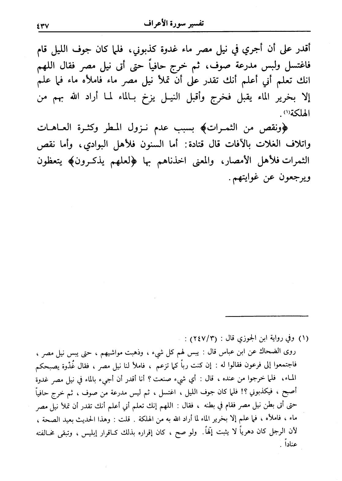 روى الضحاك عن ابن عباس قال: يبس لهم كل شيء، وذهبت مواشيهم، حتى يبس نيل مصر، فاجتمعوا إلى فرعون فقالوا له: إن كنت رباً كما تزعم، فاملأ لنا نيل مصر، فقال غُدوة يصبحكم الماء، فلما خرجوا من عنده، قال: أي شيء صنعت؟ أنا أقدر أن أجيء بالماء في نيل مصر غدوة أصبح، فيكذبوني؟! فلما كان جوف الليل، اغتسل، ثم لبس مدرعة من صوف، ثم خرج حافياً حتى أتى بطن نيل مصر فقام في بطنه، فقال: اللهم إنك تعلم أني أعلم أنك تقدر أن تملأ نيل مصر ماء، فاملأه، فما علم إلا بخرير الماء لما أراد الله به من الهلكة. قلت: وهذا الحديث بعيد الصحة، لأن الرجل كان دهرياً لا يثبت إلهاً. ولو صح، كان إقراره بذلك كإقرار إبليس، وتبقى مخالفته عناداً.