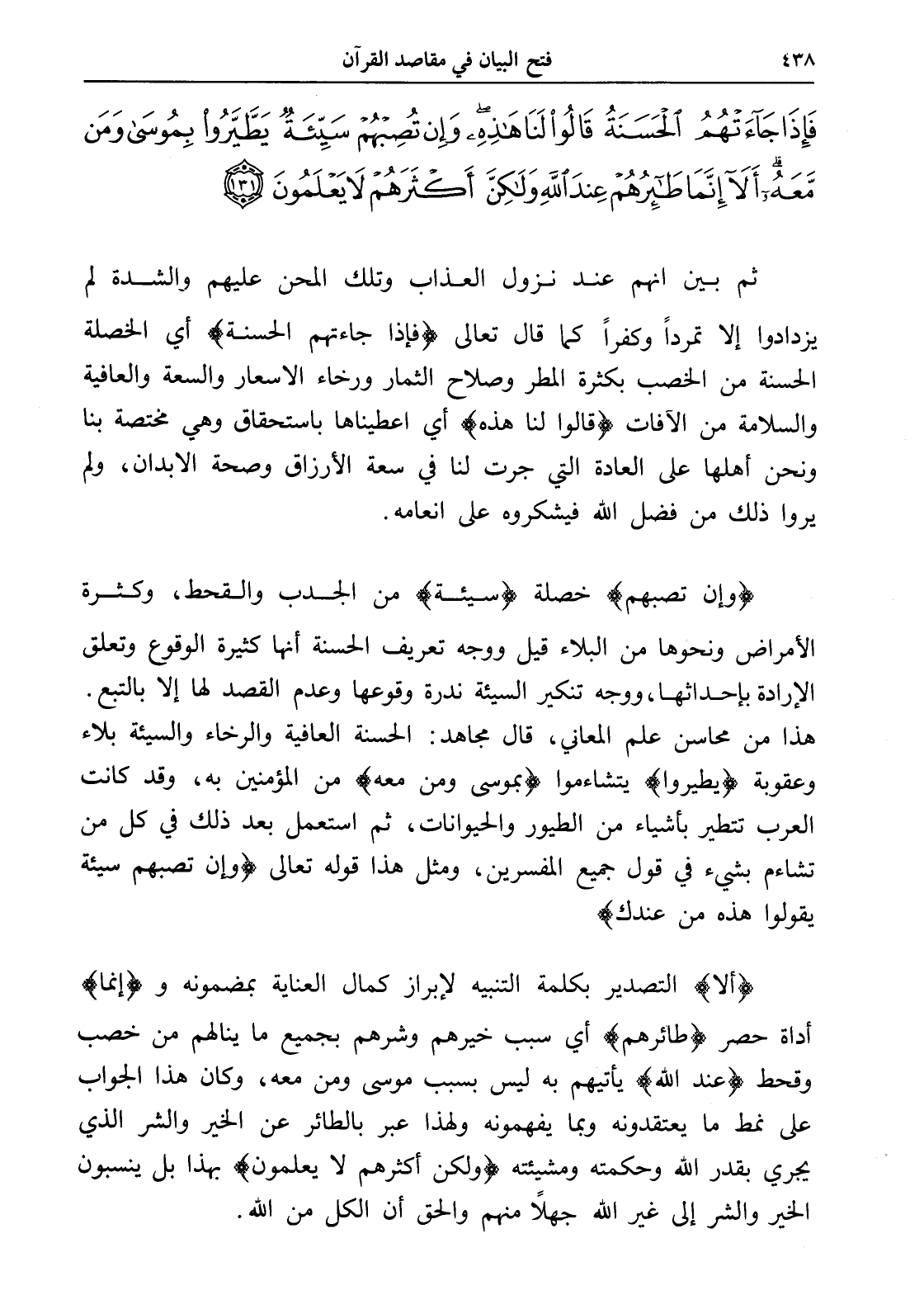 فَإِذَا جَاءَتْهُمُ الْحَسَنَةُ قَالُوا لَنَا هَذِهِ وَإِنْ تُصِبْهُمْ سَيِّئَةٌ يَطَّيَّرُوا بِمُوسَى وَمَنْ مَعَهُ أَلَا إِنَّمَا طَائِرُهُمْ عِنْدَ اللَّهِ وَلَكِنَّ أَكْثَرَهُمْ لَا يَعْلَمُونَ (131)