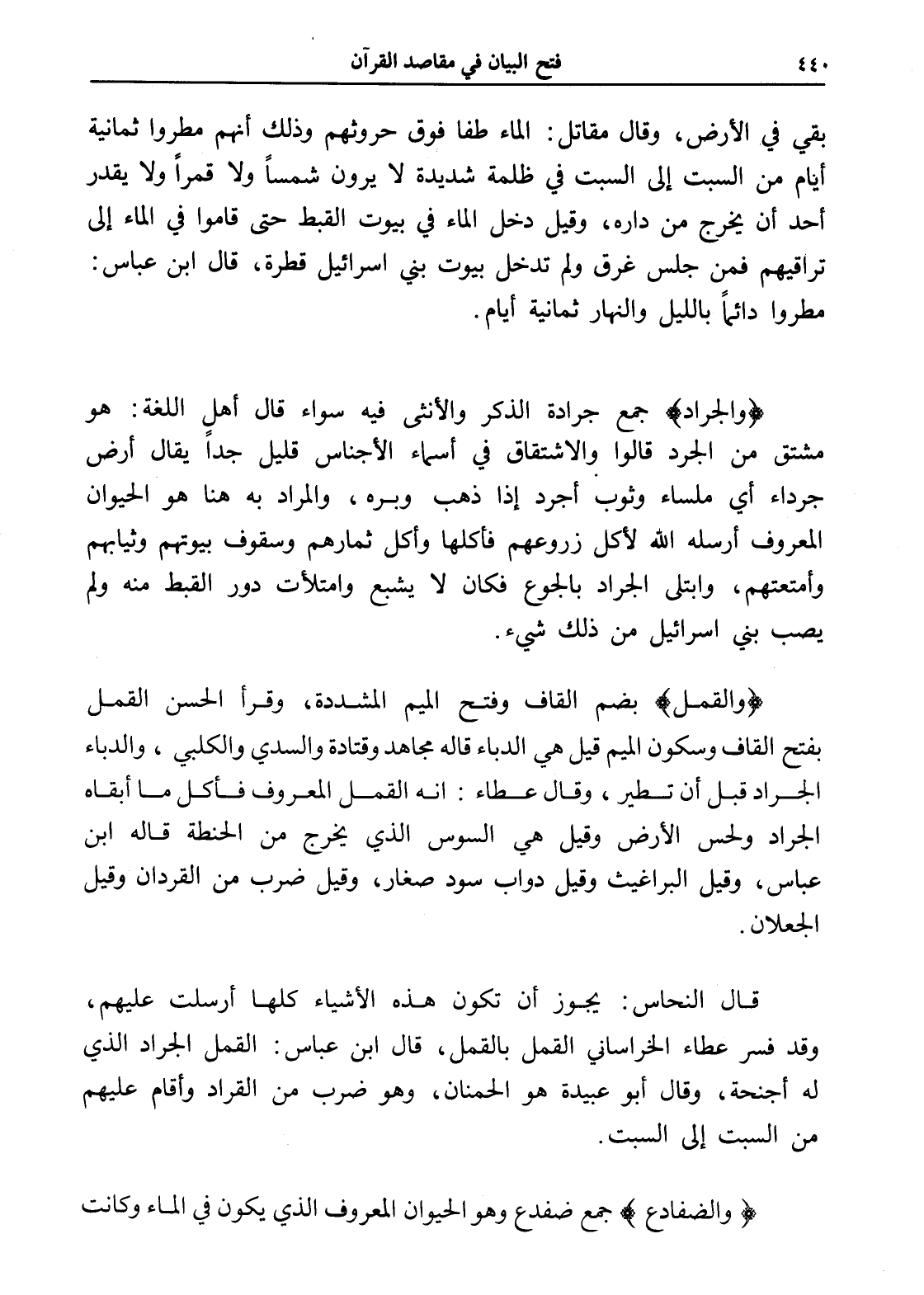 (والجراد) جمع جرادة الذكر والأنثى فيه سواء قال أهل اللغة: هو مشتق من الجرد قالوا والاشتقاق في أسماء الأجناس قليل جداً يقال أرض جرداء أي ملساء وثوب أجرد إذا ذهب وبره، والمراد به هنا هو الحيوان المعروف أرسله الله لأكل زروعهم فأكلها وأكل ثمارهم وسقوف بيوتهم وثيابهم وأمتعتهم، وابتلى الجراد بالجوع فكان لا يشبع وامتلأت دور القبط منه ولم يصب بني إسرائيل من ذلك شيء.