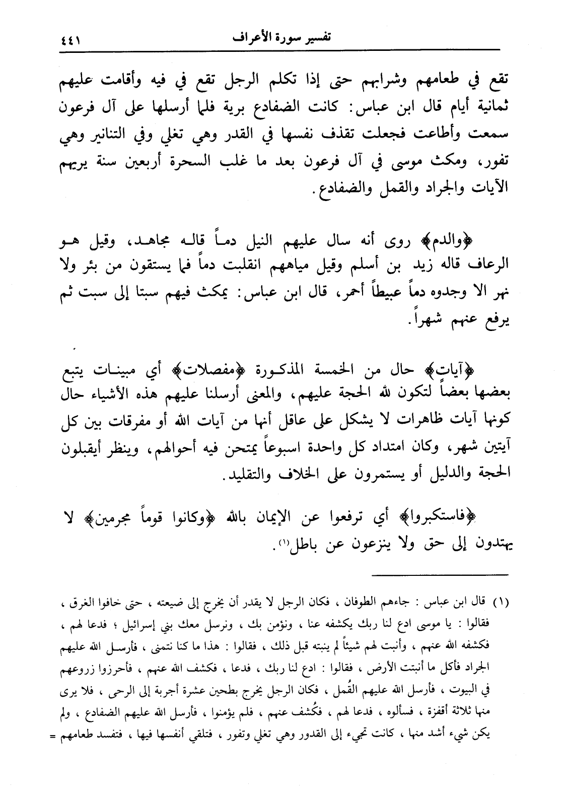 (¬1) قال ابن عباس: جاءهم الطوفان، فكان الرجل لا يقدر أن يخرج إلى ضيعته، حتى خافوا الغرق، فقالوا: يا موسى ادع لنا ربك يكشفه عنا، ونؤمن بك، ونرسل معك بني إسرائيل؛ فدعا لهم، فكشفه الله عنهم، وأنبت لهم شيئاً لم ينبته قبل ذلك، فقالوا: هذا ما كنا نتمنى، فأرسل الله عليهم الجراد فأكل ما أنبتت الأرض، فقالوا: ادع لنا ربك، فدعا، فكشف الله عنهم، فأحرزوا زروعهم في البيوت، فأرسل الله عليهم القُمل، فكان الرجل يخرج بطحين عشرة أجربة إلى الرحى، فلا يرى منها ثلاثة أقفزة، فسألوه، فدعا لهم، فكُشف عنهم، فلم يؤمنوا، فأرسل الله عليهم الضفادع، ولم يكن شيء أشد منها، كانت تجيء إلى القدور وهي تغلي وتفور، فتلقي أنفسها فيها، فتفسد طعامهم
