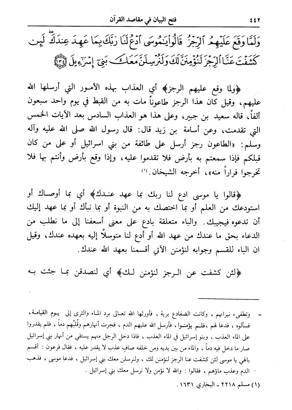 وَلَمَّا وَقَعَ عَلَيْهِمُ الرِّجْزُ قَالُوا يَا مُوسَى ادْعُ لَنَا رَبَّكَ بِمَا عَهِدَ عِنْدَكَ لَئِنْ كَشَفْتَ عَنَّا الرِّجْزَ لَنُؤْمِنَنَّ لَكَ وَلَنُرْسِلَنَّ مَعَكَ بَنِي إِسْرَائِيلَ (134)