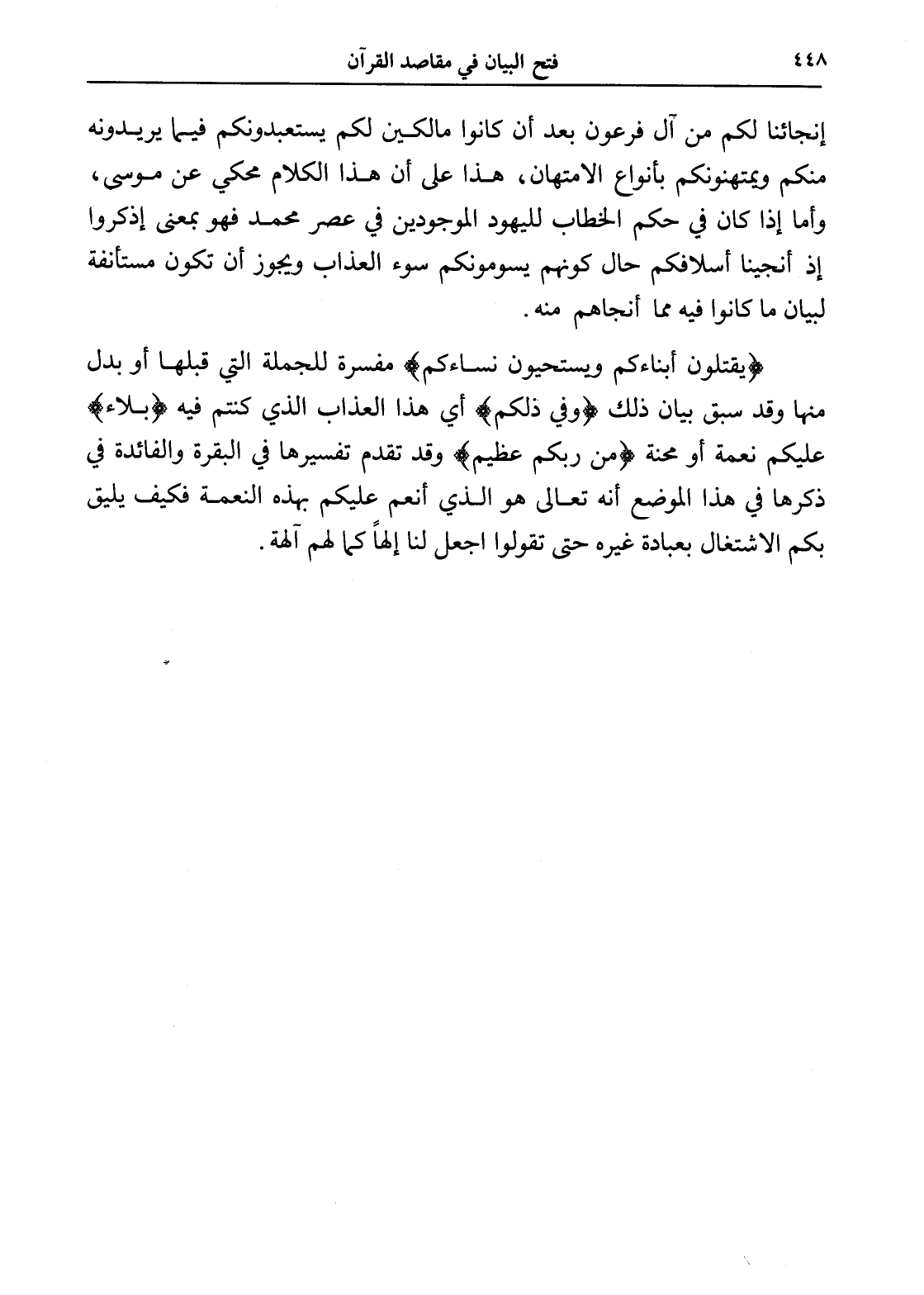 (يقتلون أبناءكم ويستحيون نساءكم) مفسرة للجملة التي قبلها أو بدل منها وقد سبق بيان ذلك (وفي ذلكم) أي هذا العذاب الذي كنتم فيه (بلاء) عليكم نعمة أو محنة (من ربكم عظيم) وقد تقدم تفسيرها في البقرة والفائدة في ذكرها في هذا الموضع أنه تعالى هو الذي أنعم عليكم بهذه النعمة فكيف يليق بكم الاشتغال بعبادة غيره حتى تقولوا اجعل لنا إلهاً كما لهم آلهة.