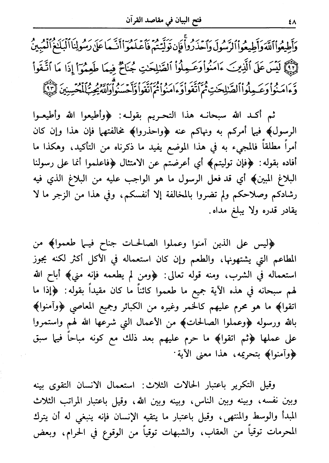 وَأَطِيعُوا اللَّهَ وَأَطِيعُوا الرَّسُولَ وَاحْذَرُوا فَإِنْ تَوَلَّيْتُمْ فَاعْلَمُوا أَنَّمَا عَلَى رَسُولِنَا الْبَلَاغُ الْمُبِينُ (92) لَيْسَ عَلَى الَّذِينَ آمَنُوا وَعَمِلُوا الصَّالِحَاتِ جُنَاحٌ فِيمَا طَعِمُوا إِذَا مَا اتَّقَوْا وَآمَنُوا وَعَمِلُوا الصَّالِحَاتِ ثُمَّ اتَّقَوْا وَآمَنُوا ثُمَّ اتَّقَوْا وَأَحْسَنُوا وَاللَّهُ يُحِبُّ الْمُحْسِنِينَ (93)