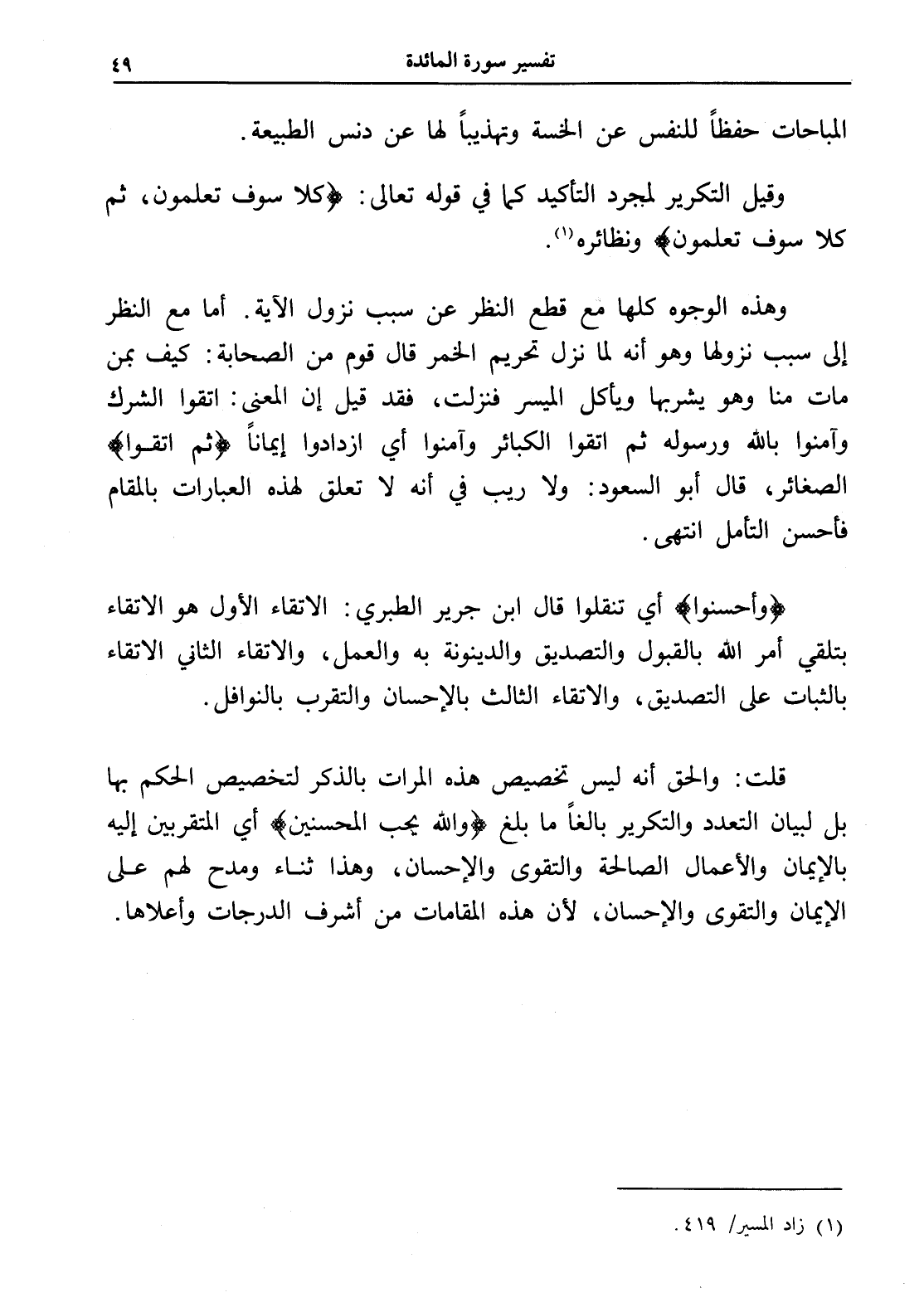 وهذه الوجوه كلها مع قطع النظر عن سبب نزول الآية. أما مع النظر إلى سبب نزولها وهو أنه لما نزل تحريم الخمر قال قوم من الصحابة: كيف بمن مات منا وهو يشربها ويأكل الميسر فنزلت، فقد قيل إن المعنى: اتقوا الشرك وآمنوا بالله ورسوله ثم اتقوا الكبائر وآمنوا أي ازدادوا إيماناً (ثم اتقوا) الصغائر، قال أبو السعود: ولا ريب في أنه لا تعلق لهذه العبارات بالمقام فأحسن التأمل انتهى.