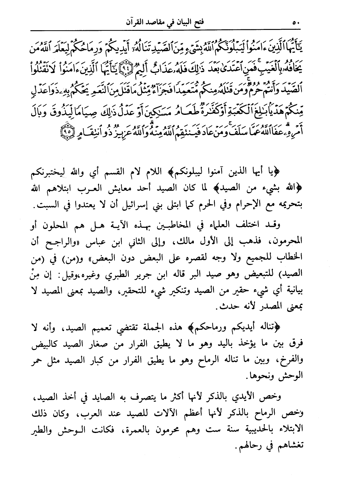 يَا أَيُّهَا الَّذِينَ آمَنُوا لَيَبْلُوَنَّكُمُ اللَّهُ بِشَيْءٍ مِنَ الصَّيْدِ تَنَالُهُ أَيْدِيكُمْ وَرِمَاحُكُمْ لِيَعْلَمَ اللَّهُ مَنْ يَخَافُهُ بِالْغَيْبِ فَمَنِ اعْتَدَى بَعْدَ ذَلِكَ فَلَهُ عَذَابٌ أَلِيمٌ (94) يَا أَيُّهَا الَّذِينَ آمَنُوا لَا تَقْتُلُوا الصَّيْدَ وَأَنْتُمْ حُرُمٌ وَمَنْ قَتَلَهُ مِنْكُمْ مُتَعَمِّدًا فَجَزَاءٌ مِثْلُ مَا قَتَلَ مِنَ النَّعَمِ يَحْكُمُ بِهِ ذَوَا عَدْلٍ مِنْكُمْ هَدْيًا بَالِغَ الْكَعْبَةِ أَوْ كَفَّارَةٌ طَعَامُ مَسَاكِينَ أَوْ عَدْلُ ذَلِكَ صِيَامًا لِيَذُوقَ وَبَالَ أَمْرِهِ عَفَا اللَّهُ عَمَّا سَلَفَ وَمَنْ عَادَ فَيَنْتَقِمُ اللَّهُ مِنْهُ وَاللَّهُ عَزِيزٌ ذُو انْتِقَامٍ (95)