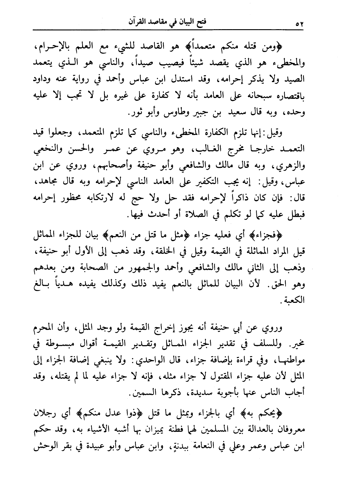 وقيل: إنها تلزم الكفارة المخطئ والناسي كما تلزم المتعمد، وجعلوا قيد التعمد خارجاً مخرج الغالب، وهو مروي عن عمر والحسن والنخعي والزهري، وبه قال مالك والشافعي وأبو حنيفة. وأصحابهم، وروي عن ابن عباس، وقيل: إنه يجب التكفير على العامد الناسي لإحرامه وبه قال مجاهد، قال: فإن كان ذاكراً لإحرامه فقد حل ولا حج له لارتكابه محظور إحرامه فبطل عليه كما لو تكلم في الصلاة أو أحدث فيها.