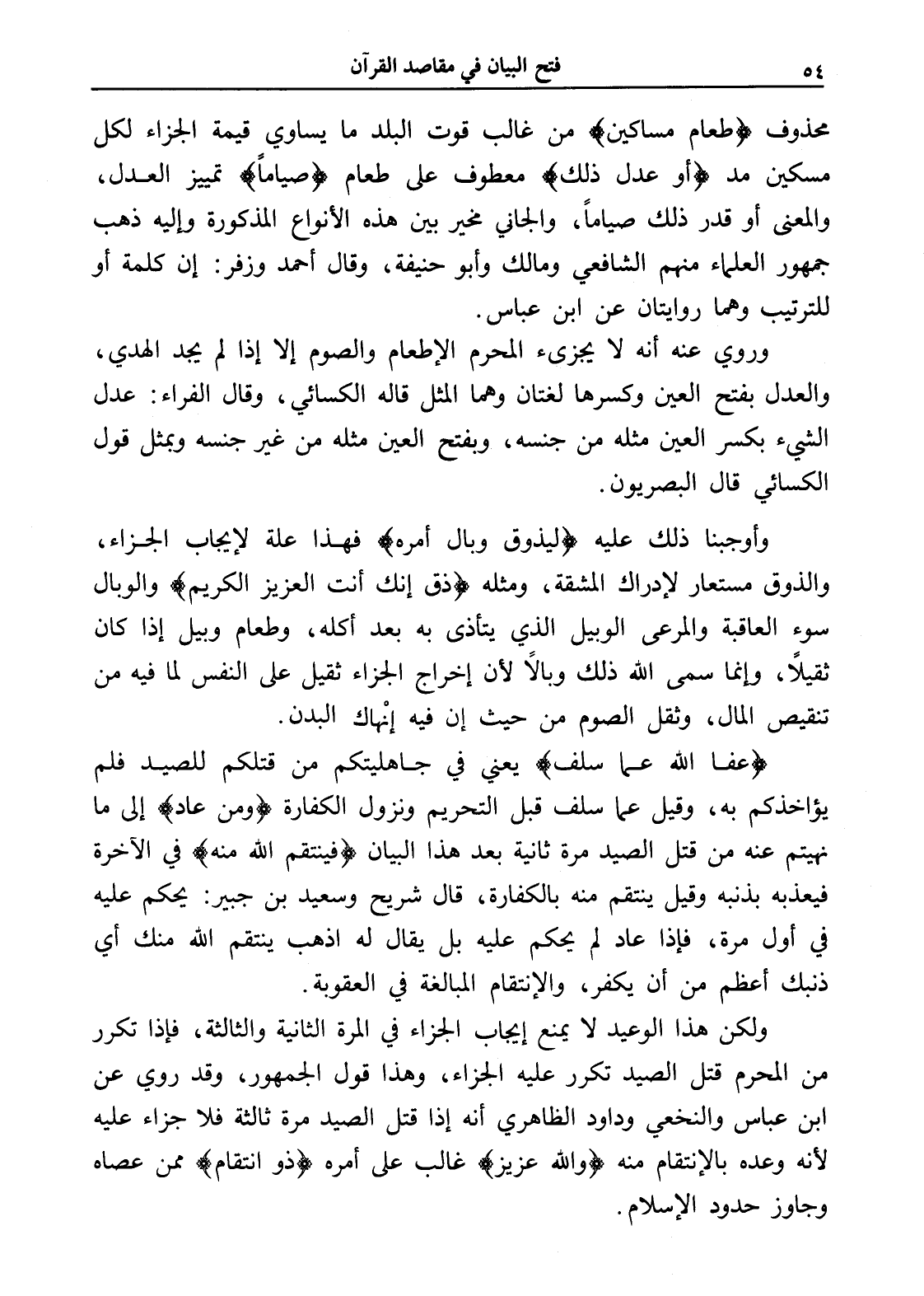 محذوف (طعام مساكين) من غالب قوت البلد ما يساوي قيمة الجزاء لكل مسكين مد (أو عدل ذلك) معطوف على طعام (صياماً) تمييز العدل، والمعنى أو قدر ذلك صياماً، والجاني مخير بين هذه الأنواع المذكورة وإليه ذهب جمهور العلماء منهم الشافعي ومالك وأبو حنيفة، وقال أحمد وزفر: إن كلمة أو للترتيب وهما روايتان عن ابن عباس.