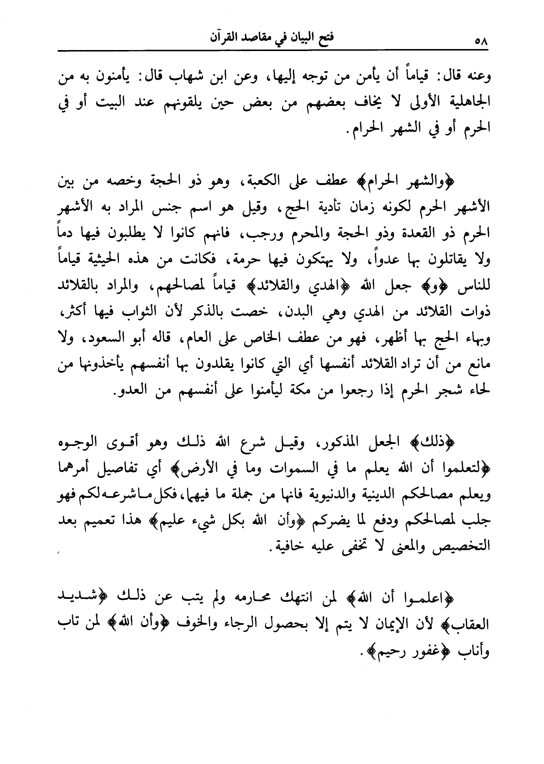 (والشهر الحرام) عطف على الكعبة، وهو ذو الحجة وخصه من بين الأشهر الحرم لكونه زمان تأدية الحج، وقيل هو اسم جنس المراد به الأشهر الحرم ذو القعدة وذو الحجة والمحرم ورجب، فإنهم كانوا لا يطلبون فيها دماً ولا يقاتلون بها عدواً، ولا يهتكون فيها حرمة، فكانت من هذه الحيثية قياماً للناس (و) جعل الله (الهدي والقلائد) قياماً لمصالحهم، والمراد بالقلائد ذوات القلائد من الهدي وهي البدن، خصت بالذكر لأن الثواب فيها أكثر، وبهاء الحج بها أظهر، فهو من عطف الخاص على العام، قاله أبو السعود، ولا مانع من أن تراد القلائد أنفسها أي التي كانوا يقلدون بها أنفسهم يأخذونها من لحاء شجر الحرم إذا رجعوا من مكة ليأمنوا على أنفسهم من العدو.