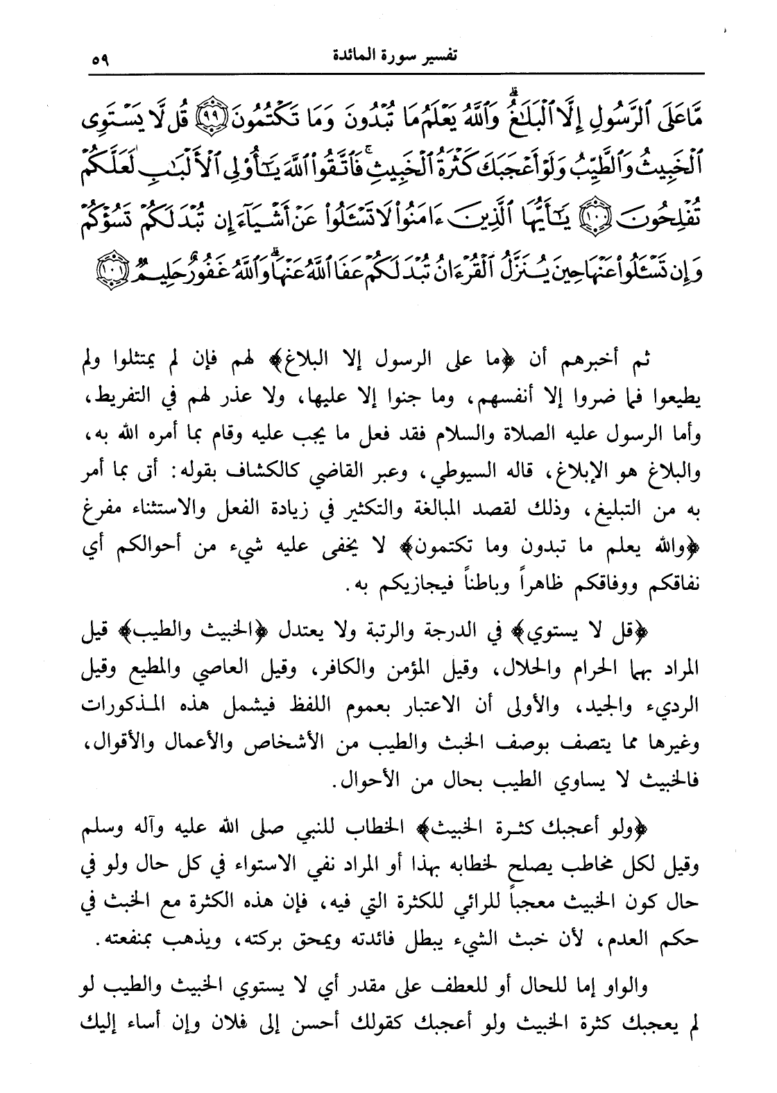 مَا عَلَى الرَّسُولِ إِلَّا الْبَلَاغُ وَاللَّهُ يَعْلَمُ مَا تُبْدُونَ وَمَا تَكْتُمُونَ (99) قُلْ لَا يَسْتَوِي الْخَبِيثُ وَالطَّيِّبُ وَلَوْ أَعْجَبَكَ كَثْرَةُ الْخَبِيثِ فَاتَّقُوا اللَّهَ يَا أُولِي الْأَلْبَابِ لَعَلَّكُمْ تُفْلِحُونَ (100) يَا أَيُّهَا الَّذِينَ آمَنُوا لَا تَسْأَلُوا عَنْ أَشْيَاءَ إِنْ تُبْدَ لَكُمْ تَسُؤْكُمْ وَإِنْ تَسْأَلُوا عَنْهَا حِينَ يُنَزَّلُ الْقُرْآنُ تُبْدَ لَكُمْ عَفَا اللَّهُ عَنْهَا وَاللَّهُ غَفُورٌ حَلِيمٌ (101)