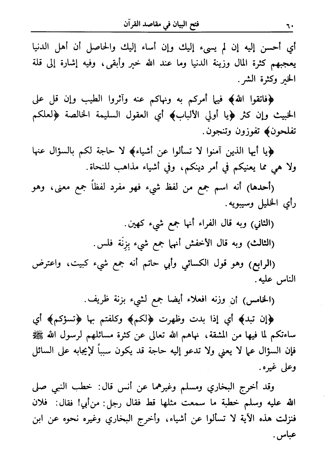 (يا أيها الذين آمنوا لا تسألوا عن أشياء) لا حاجة لكم بالسؤال عنها ولا هي مما يعنيكم في أمر دينكم، وفي أشياء مذاهب للنحاة.
