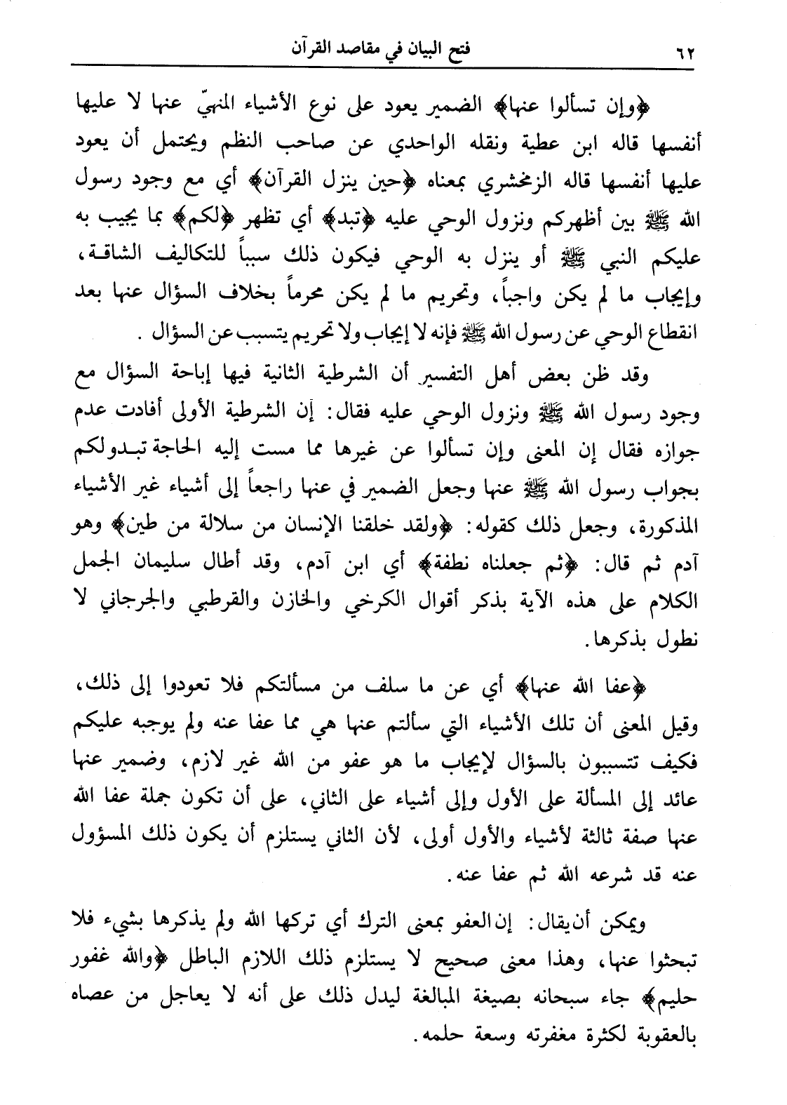 وقد ظن بعض أهل التفسير أن الشرطية الثانية فيها إباحة السؤال مع وجود رسول الله - صلى الله عليه وسلم - ونزول الوحي عليه فقال: إن الشرطية الأولى أفادت عدم جوازه فقال إن المعنى وإن تسألوا عن غيرها مما مست إليه الحاجة تبدو لكم بجواب رسول الله - صلى الله عليه وسلم - عنها وجعل الضمير في عنها راجعاً إلى أشياء غير الأشياء المذكورة، وجعل ذلك كقوله: (ولقد خلقنا الإنسان من سلالة من طين) وهو آدم ثم قال: (ثم جعلناه نطفة) أي ابن آدم، وقد أطال سليمان الجمل الكلام على هذه الآية بذكر أقوال الكرخي والخازن والقرطبي والجرجاني لا نطول بذكرها.