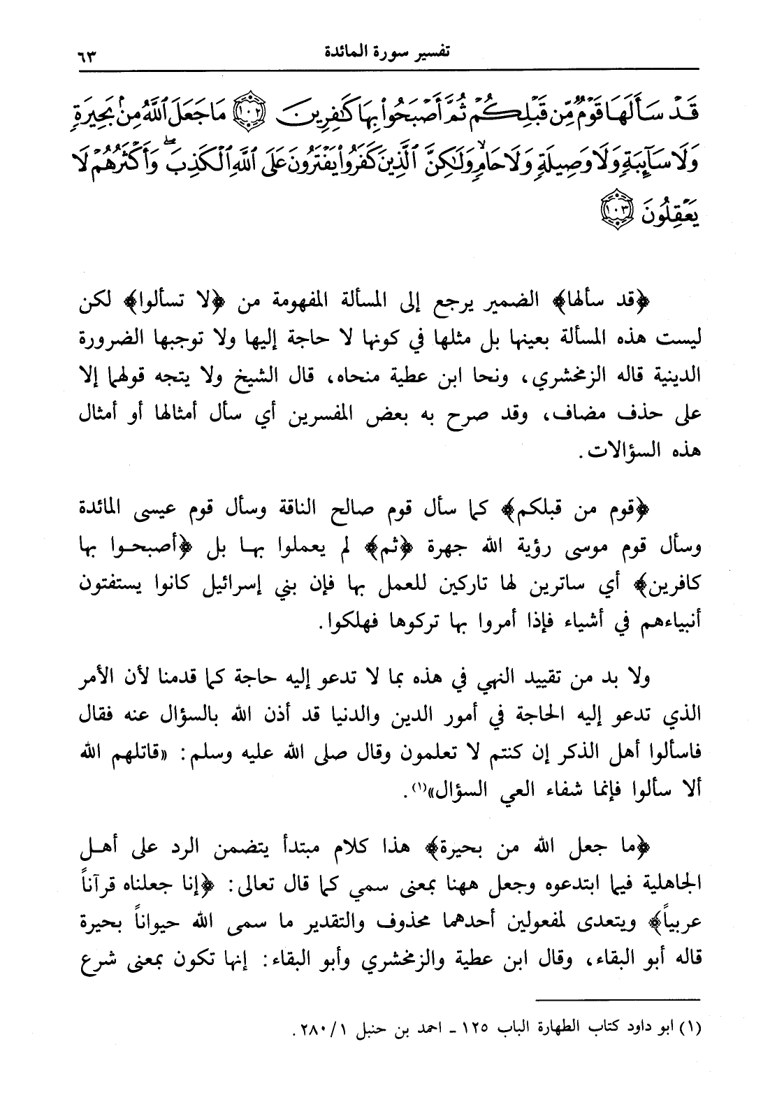 قَدْ سَأَلَهَا قَوْمٌ مِنْ قَبْلِكُمْ ثُمَّ أَصْبَحُوا بِهَا كَافِرِينَ (102) مَا جَعَلَ اللَّهُ مِنْ بَحِيرَةٍ وَلَا سَائِبَةٍ وَلَا وَصِيلَةٍ وَلَا حَامٍ وَلَكِنَّ الَّذِينَ كَفَرُوا يَفْتَرُونَ عَلَى اللَّهِ الْكَذِبَ وَأَكْثَرُهُمْ لَا يَعْقِلُونَ (103)