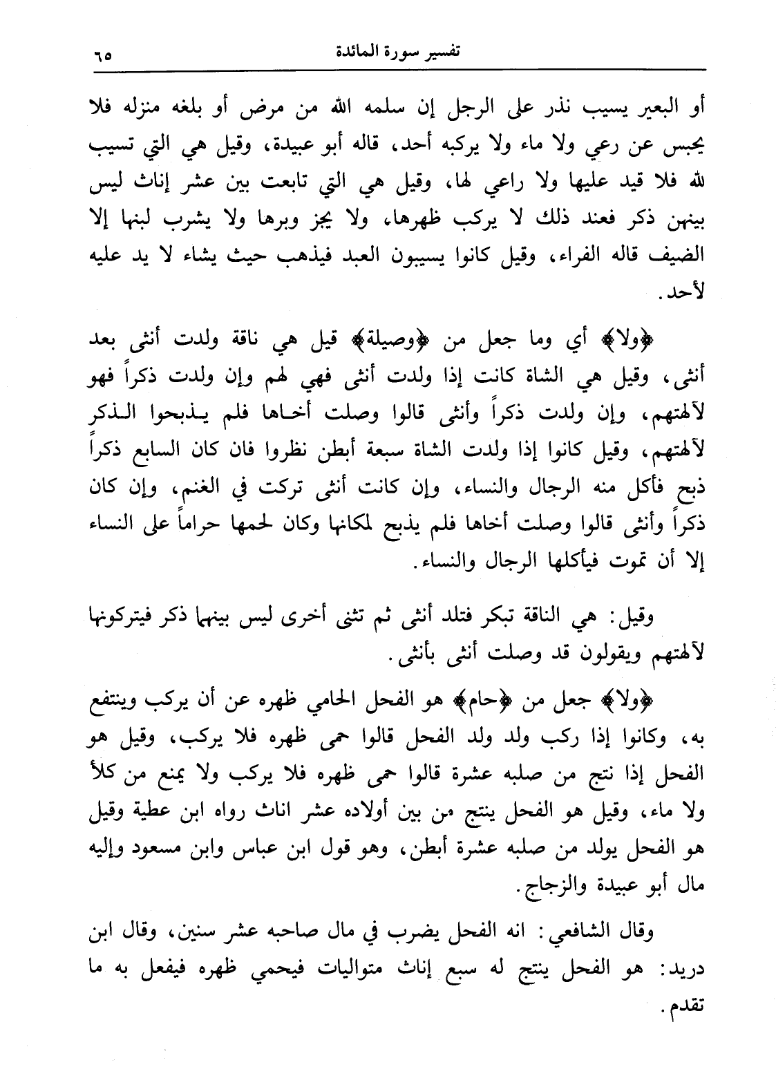 (ولا) جعل من (حام) هو الفحل الحامي ظهره عن أن يركب وينتفع به، وكانوا إذا ركب ولد ولد الفحل قالوا حمى ظهره فلا يركب، وقيل هو الفحل إذا نتج من صلبه عشرة قالوا حمى ظهره فلا يركب ولا يمنع من كلأ ولا ماء، وقيل هو الفحل ينتج من بين أولاده عشر إناث رواه ابن عطية وقيل هو الفحل يولد من صلبه عشرة أبطن، وهو قول ابن عباس وابن مسعود وإليه مال أبو عبيدة والزجاج.