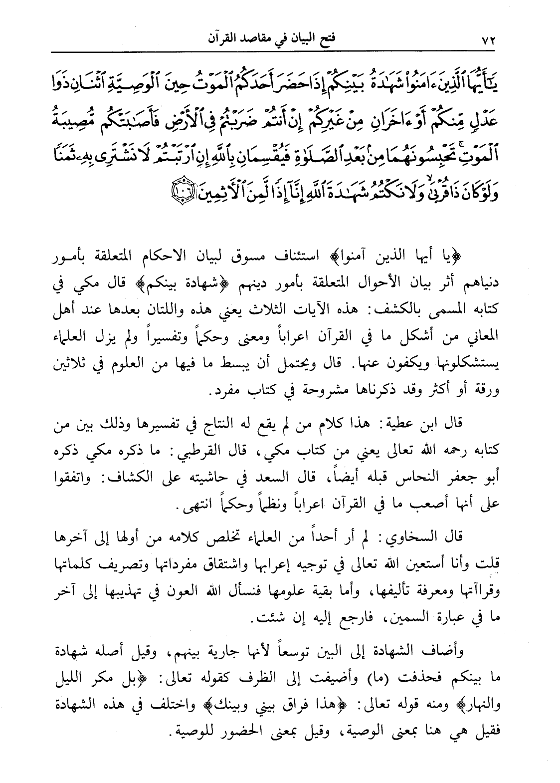 (يا أيها الذين آمنوا) استئناف مسوق لبيان الأحكام المتعلقة بأمور دنياهم أثر بيان الأحوال المتعلقة بأمور دينهم (شهادة بينكم) قال مكي في كتابه المسمى بالكشف: هذه الآيات الثلاث يعني هذه واللتان بعدها عند أهل المعاني من أشكل ما في القرآن إعراباً ومعنى وحكماً وتفسيراً ولم يزل العلماء يستشكلونها ويكفون عنها. قال ويحتمل أن يبسط ما فيها من العلوم في ثلاثين ورقة أو أكثر وقد ذكرناها مشروحة في كتاب مفرد.