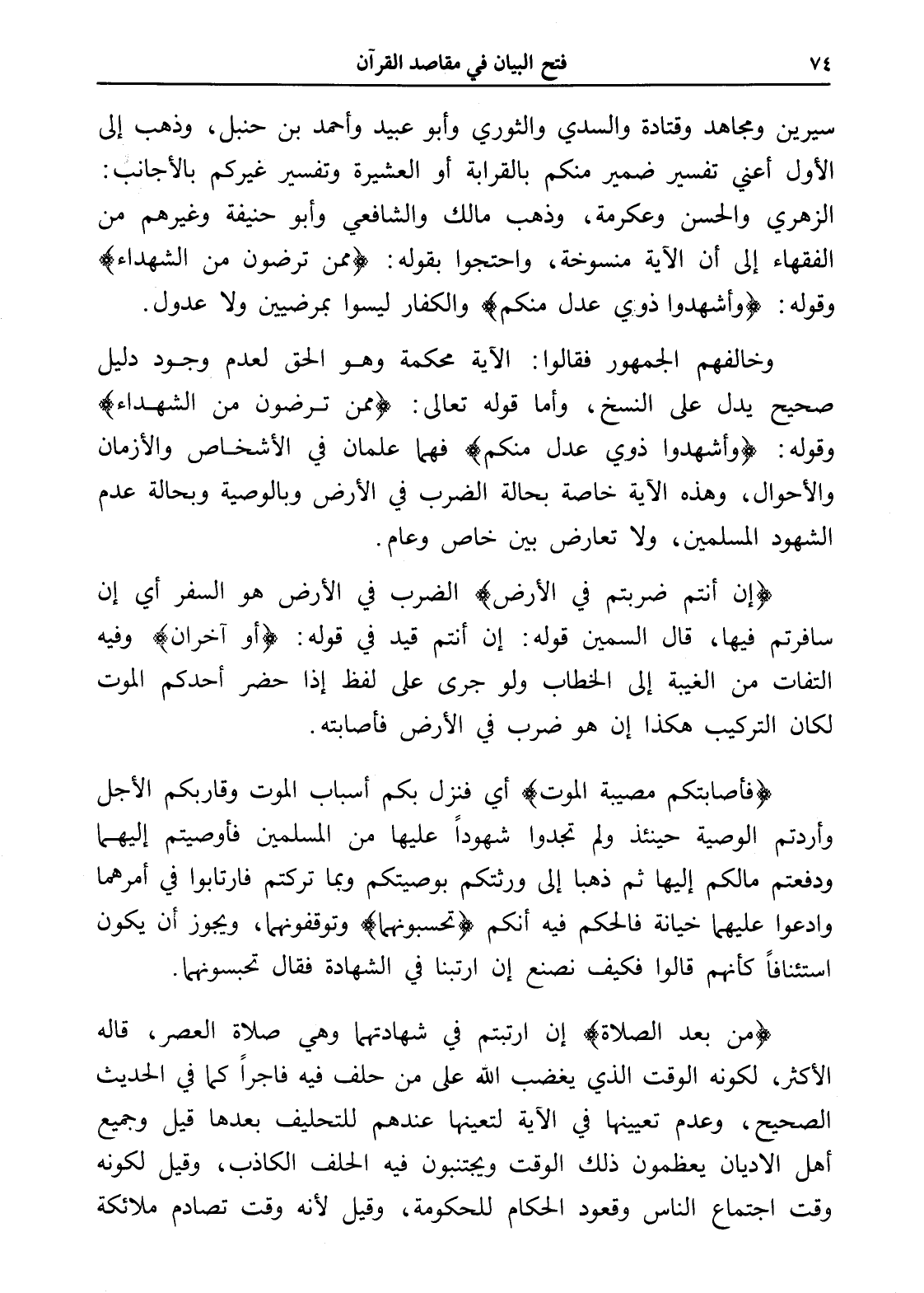 وخالفهم الجمهور فقالوا: الآية محكمة وهو الحق لعدم وجود دليل صحيح يدل على النسخ، وأما قوله تعالى: (ممن ترضون من الشهداء) وقوله: (وأشهدوا ذوي عدل منكم) فهما علمان في الأشخاص والأزمان والأحوال، وهذه الآية خاصة بحالة الضرب في الأرض وبالوصية وبحالة عدم الشهود المسلمين، ولا تعارض بين خاص وعام.